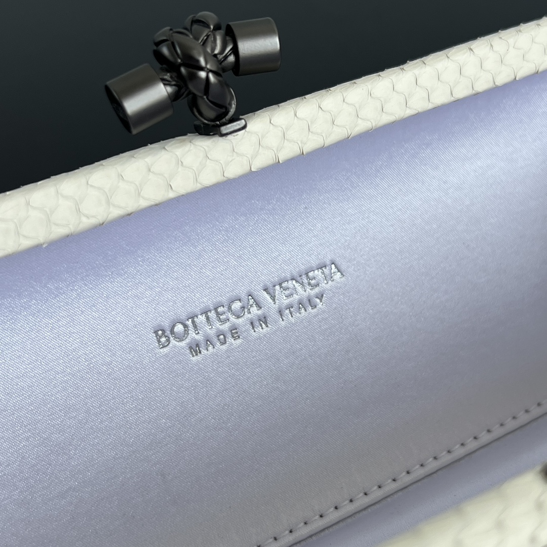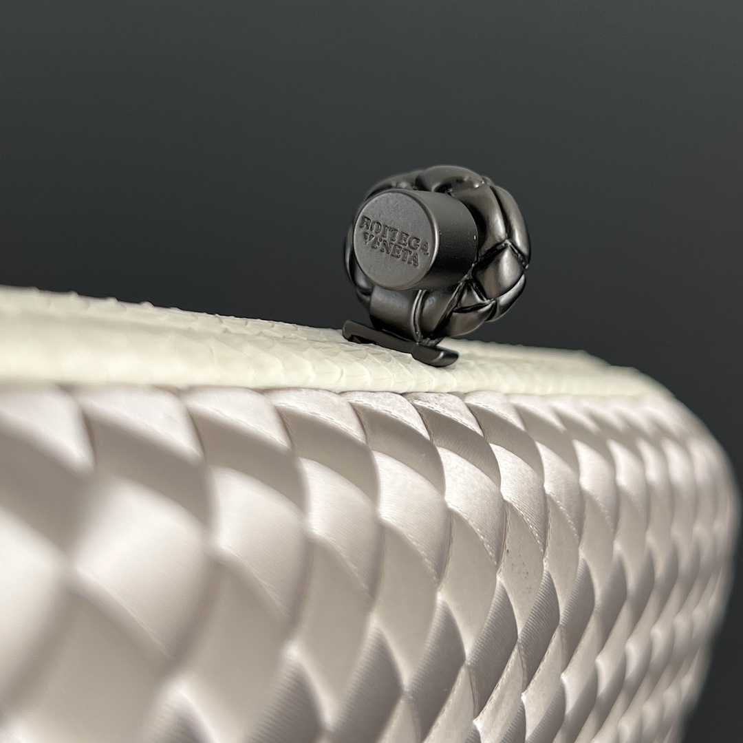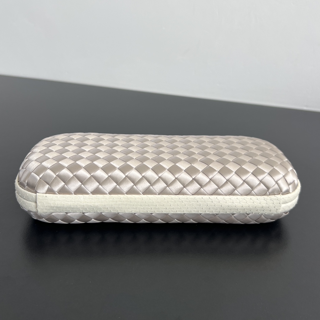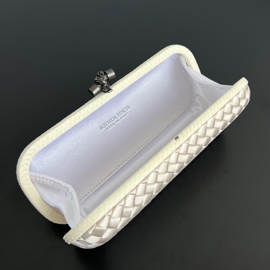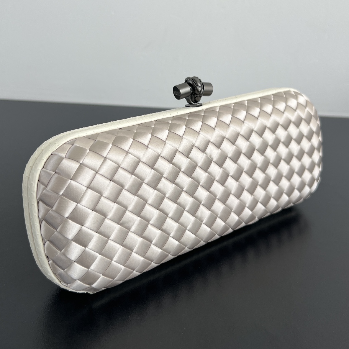 고급스러운 실크 편직으로 제작된 이 손가방은 화려한 파티 분위기를 연출합니다.