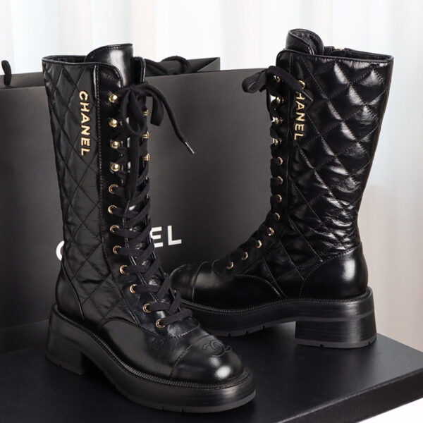 샤넬 【HAPPY】 샤이니 퀼팅 체인 레이스업 컴뱃 롱 부츠 (TJ공장)