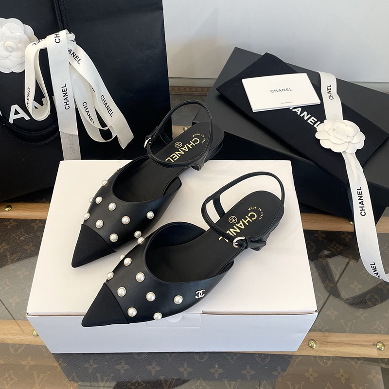 샤넬 【Happy】 25K 진주 장식 슬링백 플랫 슈즈(터보)