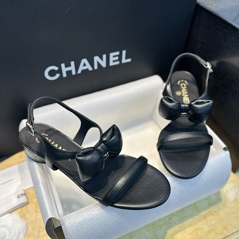 샤넬 브랜드의 여성용 샌들입니다. 리본 디자인이 포인트인 램스킨 소재 샌들입니다.
