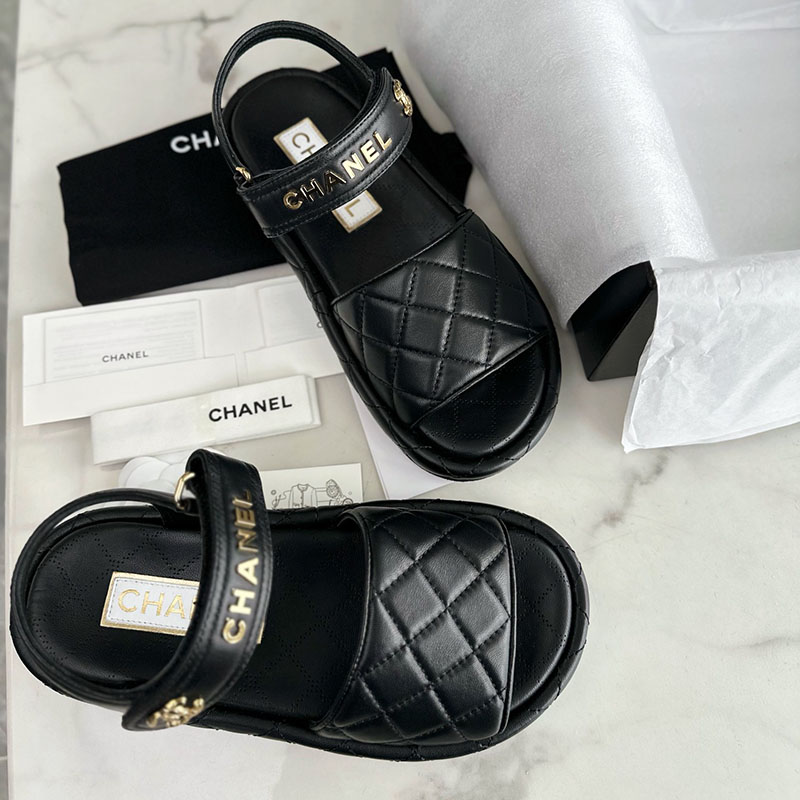 샤넬 브랜드의 샌들로, 마틀라세 퀼팅 디자인이 특징입니다. 두 가지 컬러로 선택할 수 있습니다.