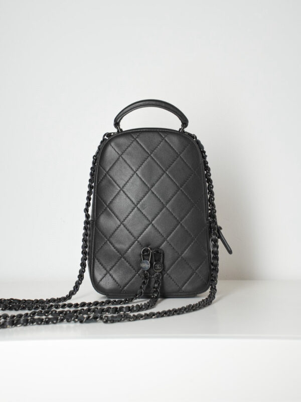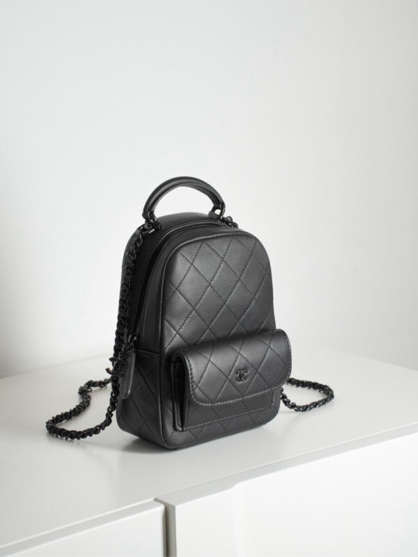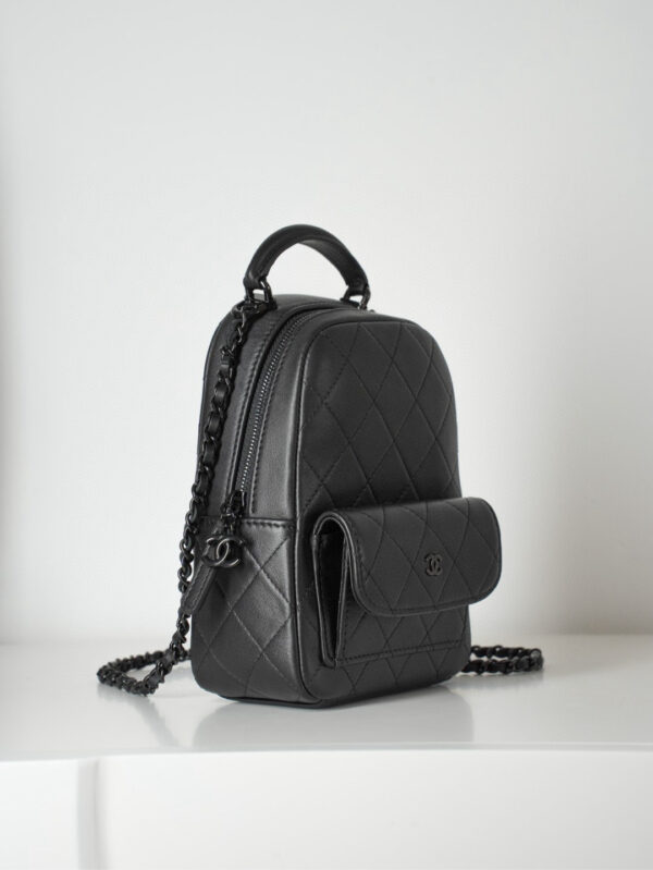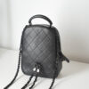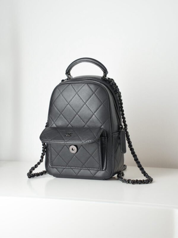 샤넬의 미니 백팩은 전면의 클래식한 퀼팅 디자인이 매력적입니다.