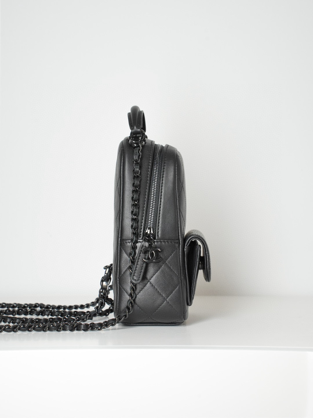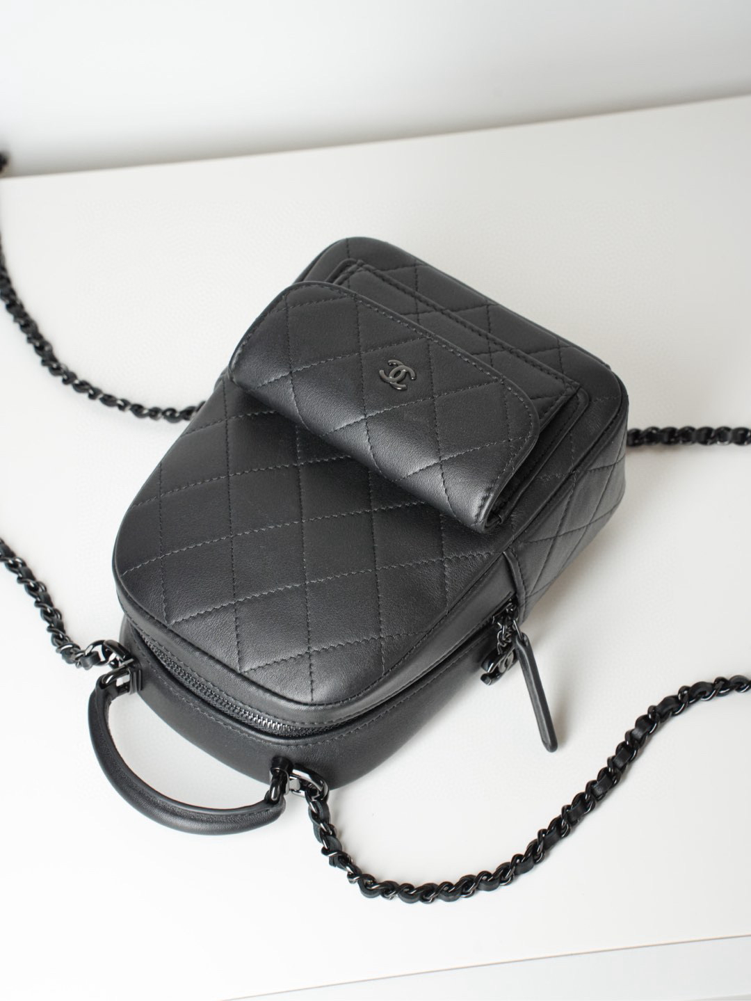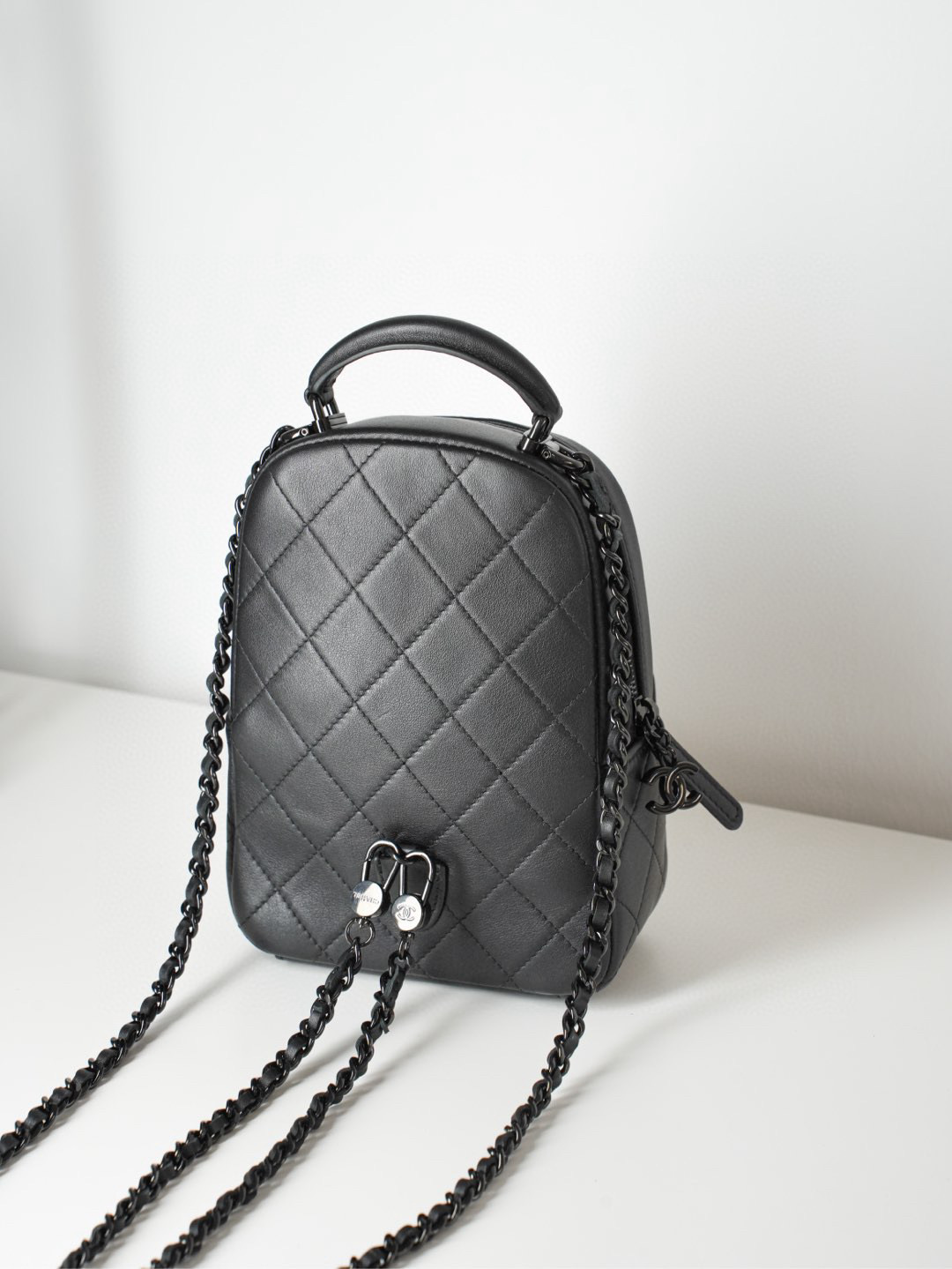 샤넬의 미니 백팩은 전면의 클래식한 퀼팅 디자인이 매력적입니다.