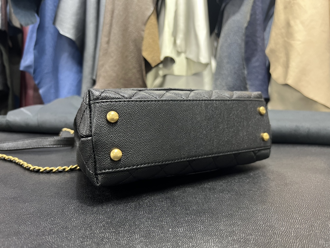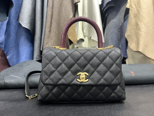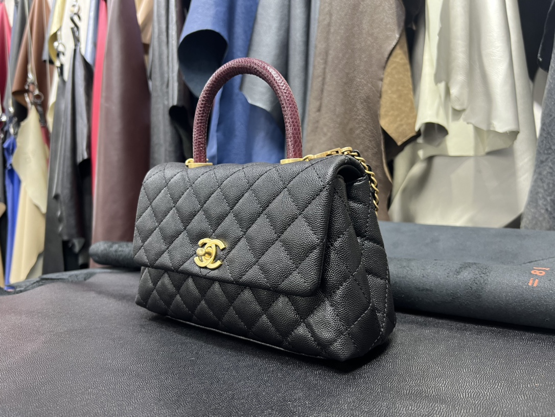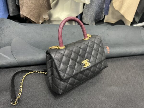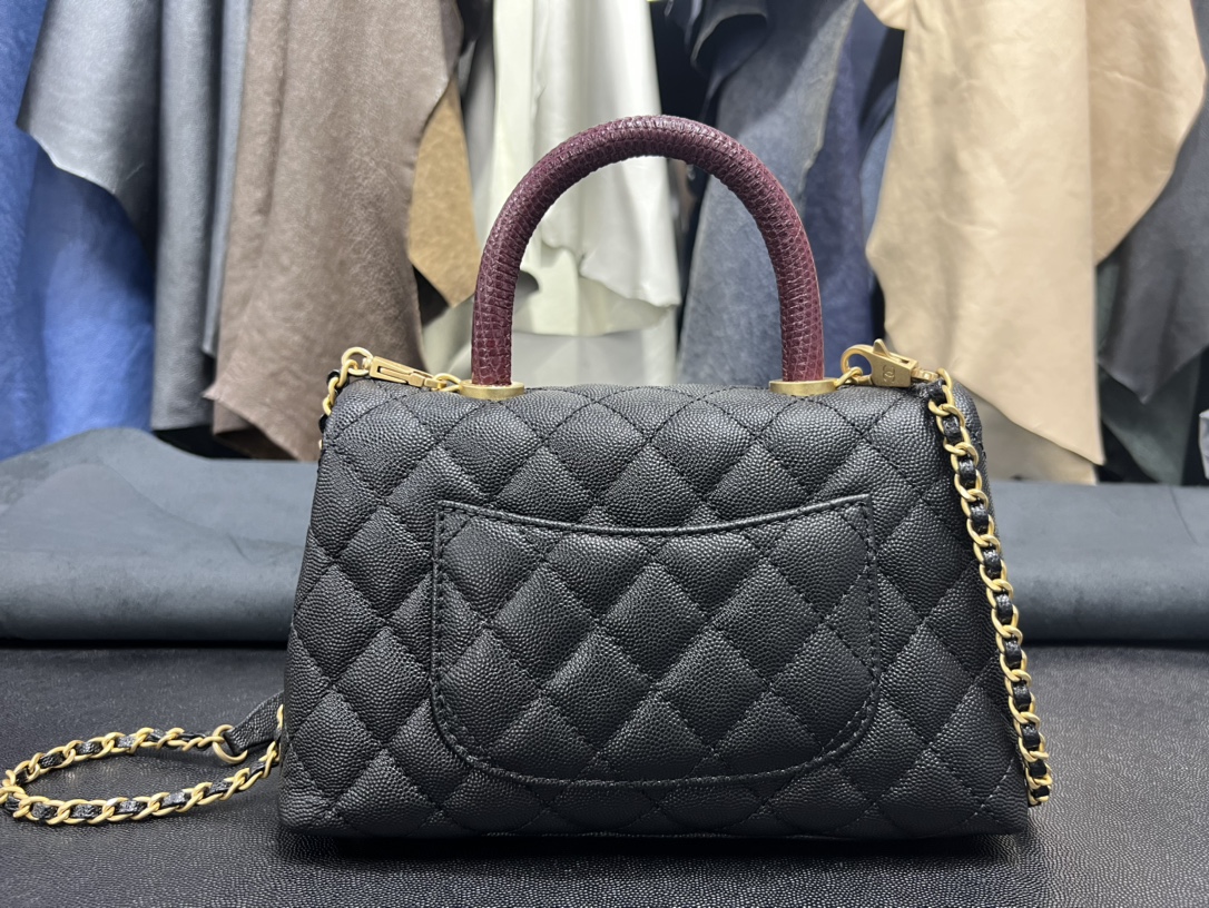 샤넬의 코코핸들 미니백은 리자드 가죽으로 제작되어 고급스러운 질감을 자랑합니다.