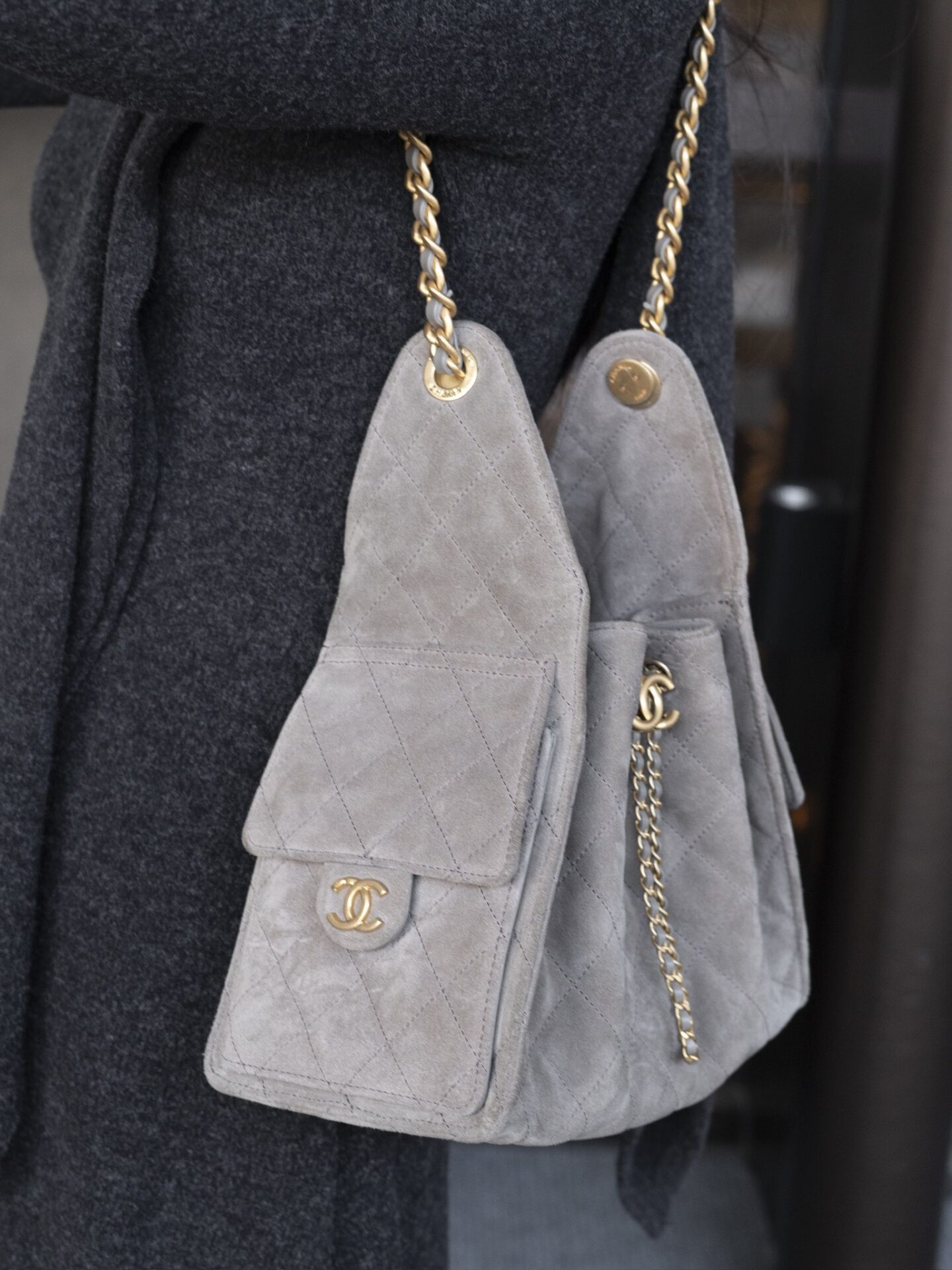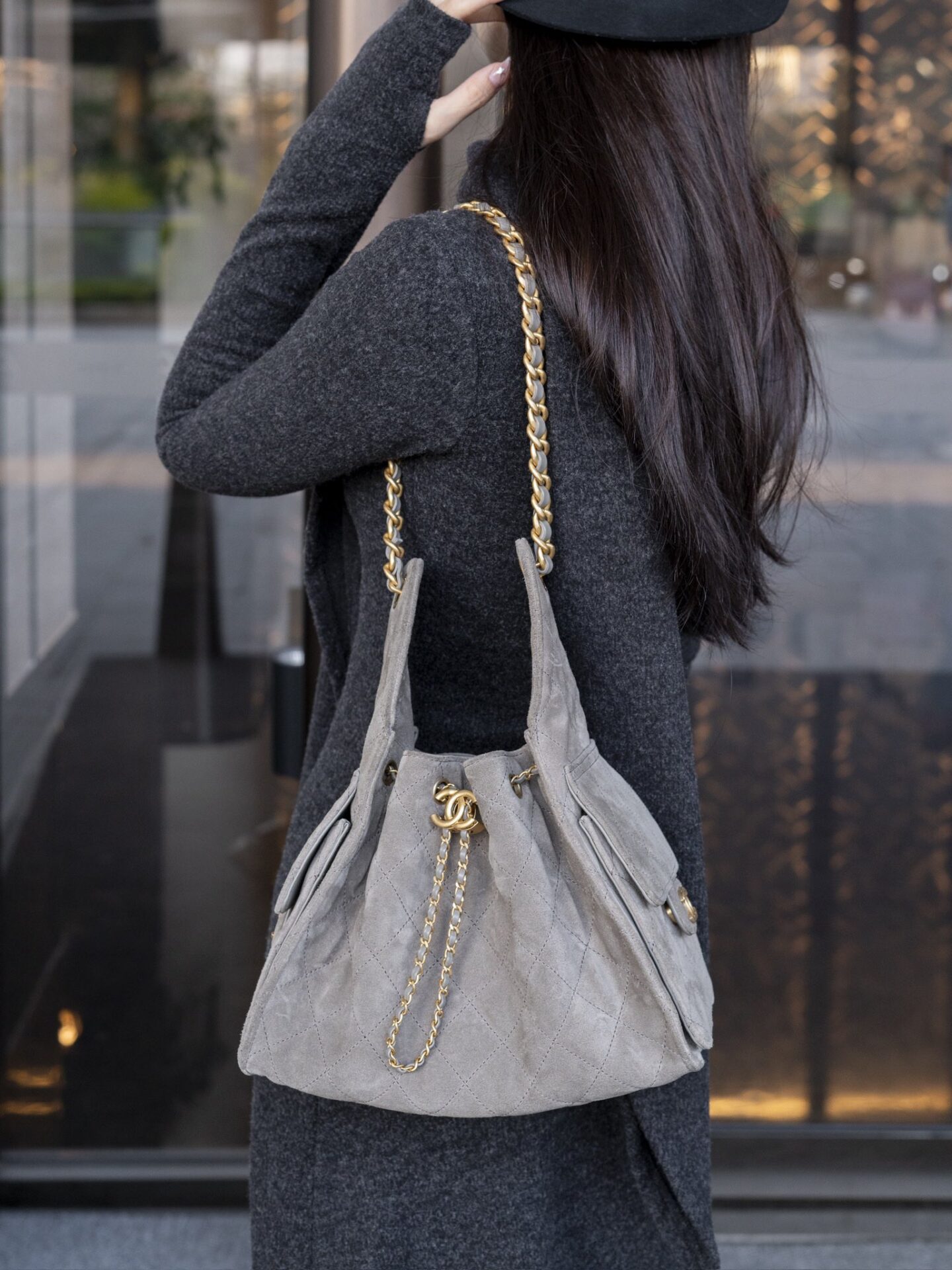 부드러운 그레이 색상의 스웨이드 소재로 제작된 이 백은 고급스러움과 세련됨을 동시에 갖추고 있습니다.