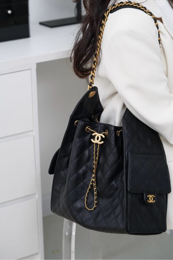 퀼팅 디자인의 블랙 백으로, 어떤 스타일에도 잘 어울립니다.