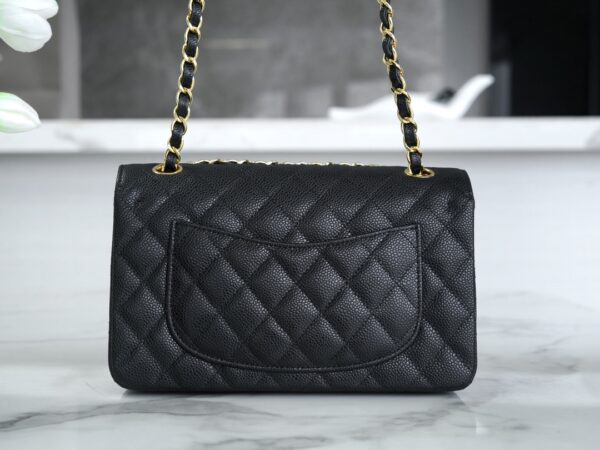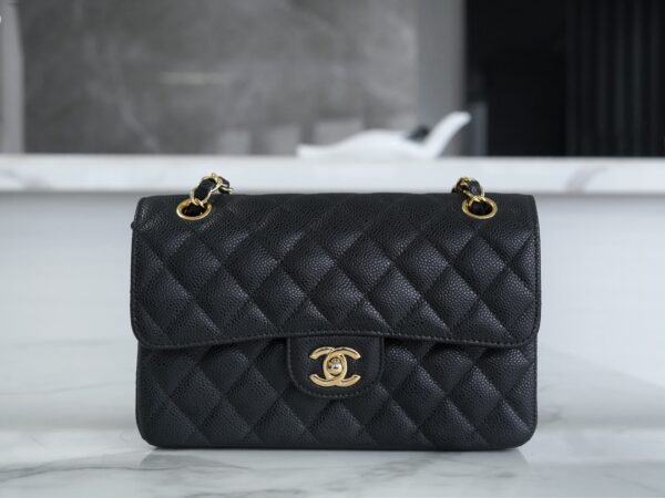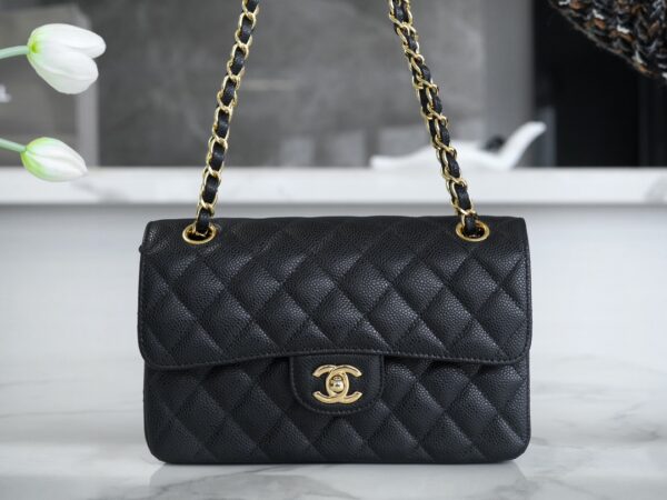 전통적인 퀼팅 디자인과 금속 체인이 조화를 이루어 우아한 매력을 더합니다.