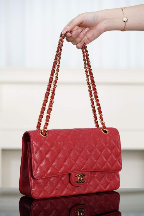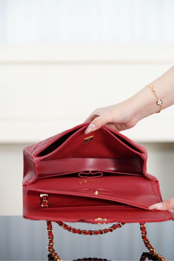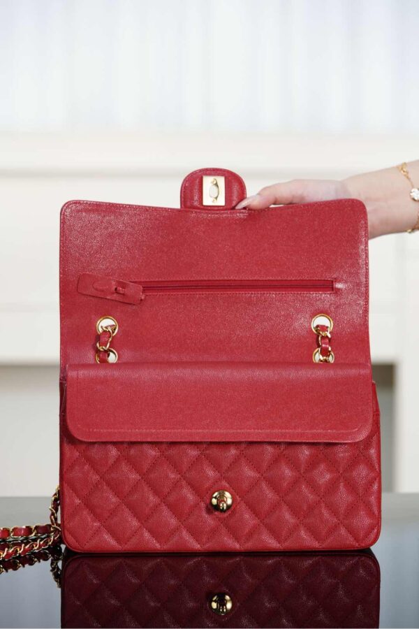 정품 태소가죽으로 제작된 클래식 플랩 백입니다. 중국 레드 색상으로, 고급스러운 광택과 질감을 자랑합니다.
