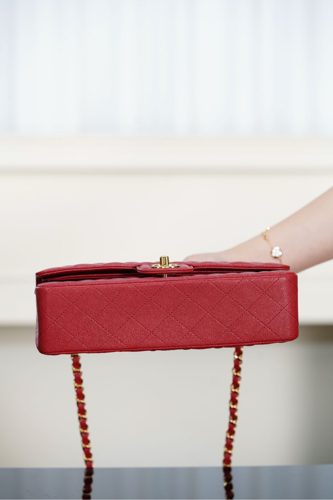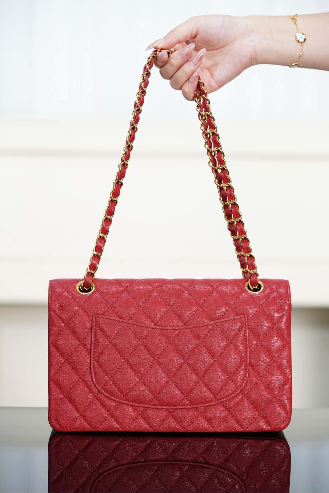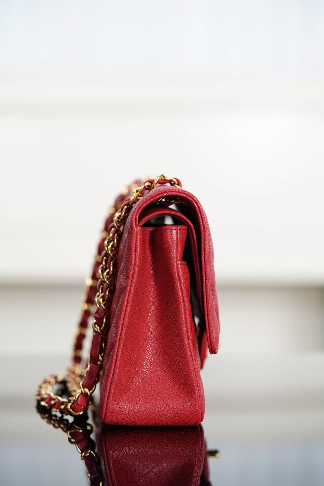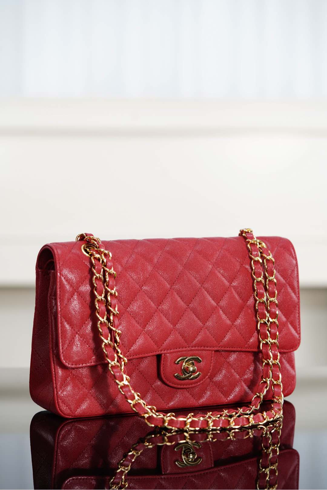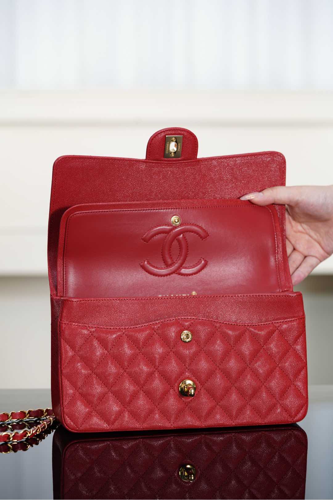 정품 태소가죽으로 제작된 클래식 플랩 백입니다. 중국 레드 색상으로, 고급스러운 광택과 질감을 자랑합니다.