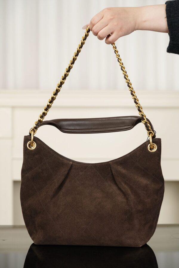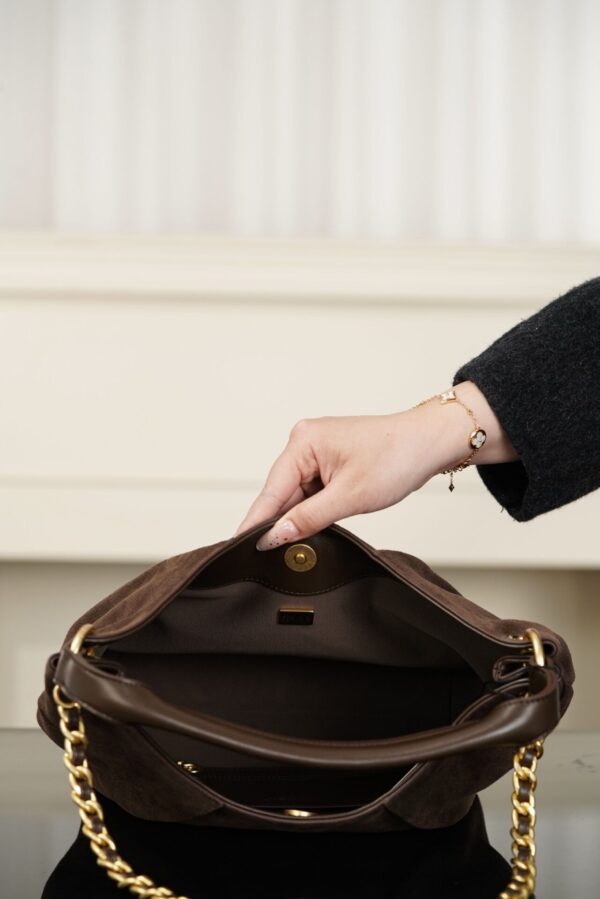 부드러운 스웨이드 소재로 제작되어 가을과 겨울에 특히 잘 어울리며, 손잡이와 금속 체인을 활용해 다양한 스타일로 연출할 수 있습니다.