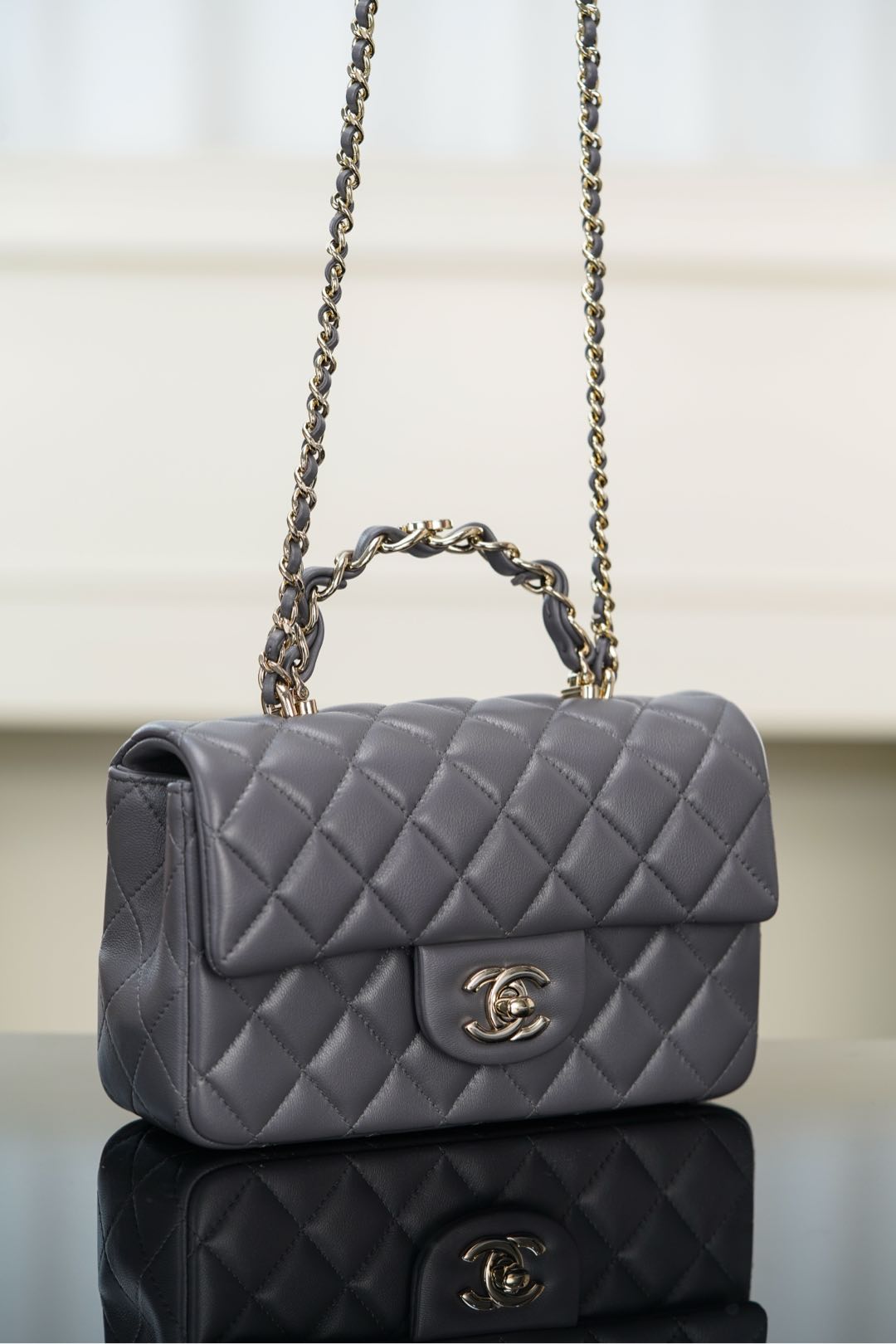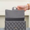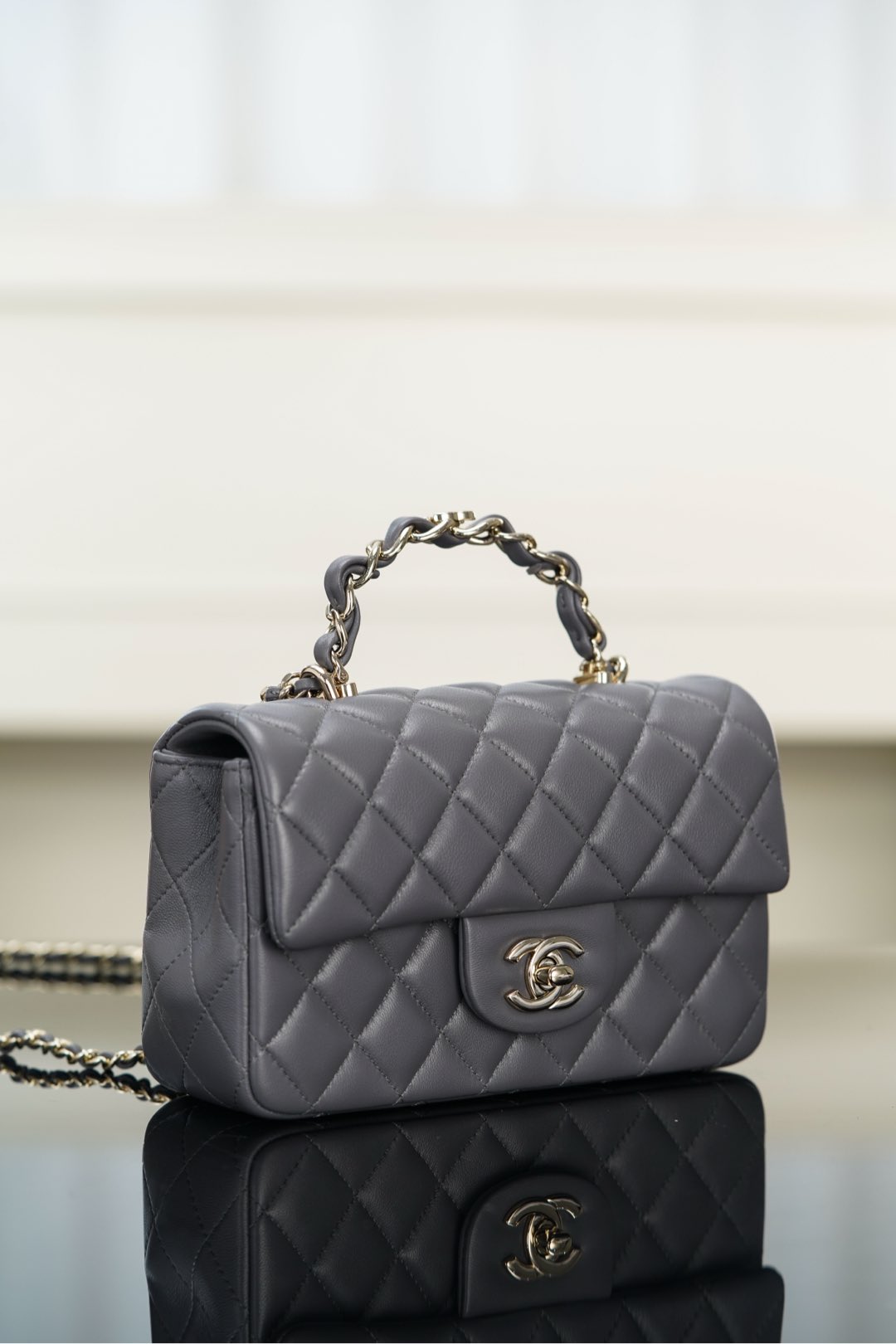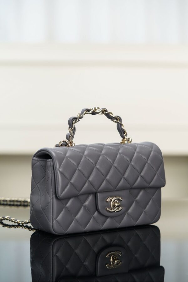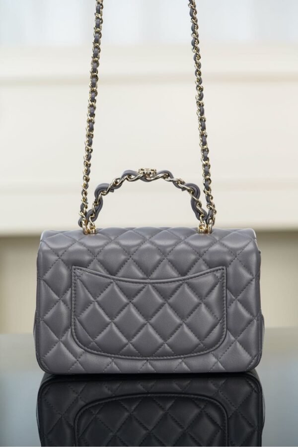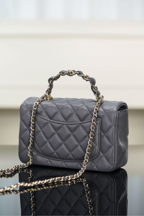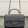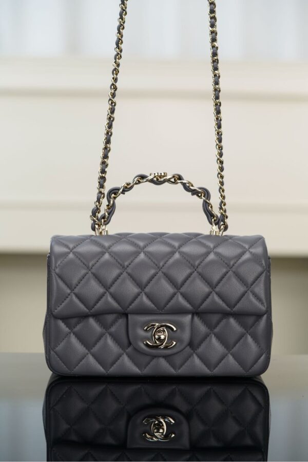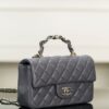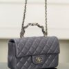 샤넬의 23k 가을겨울 신상 더블 C 핸들 CF 미니백입니다. 깊은 회색의 우아한 색감이 돋보이며, 고급스러운 가죽 소재로 제작되어 세련된 느낌을 줍니다.