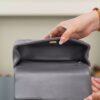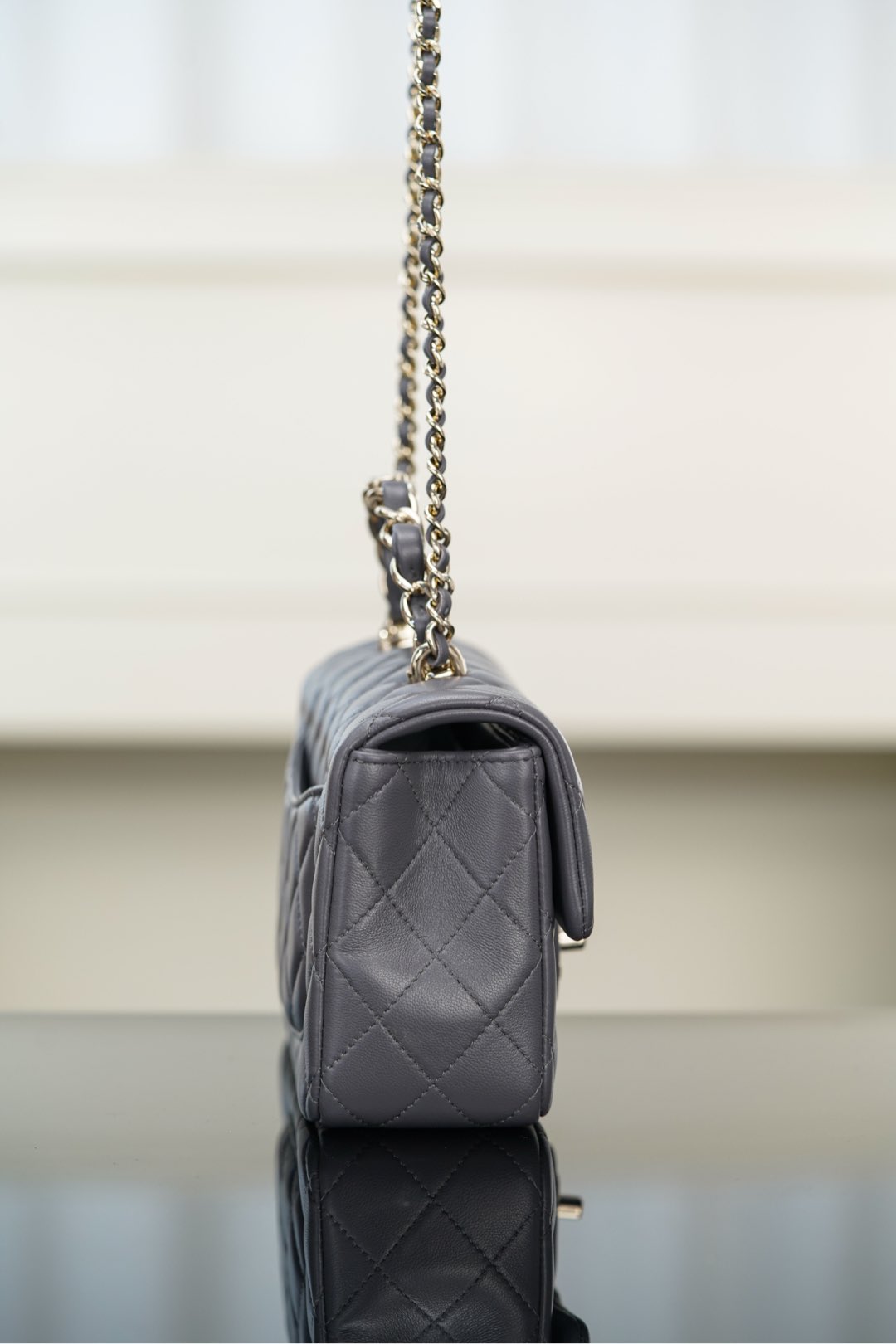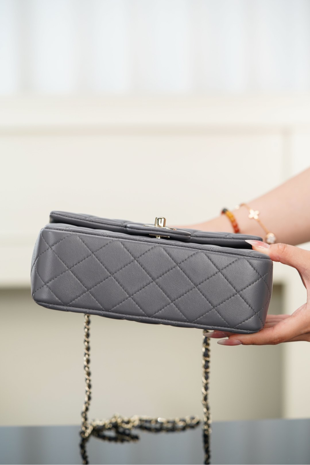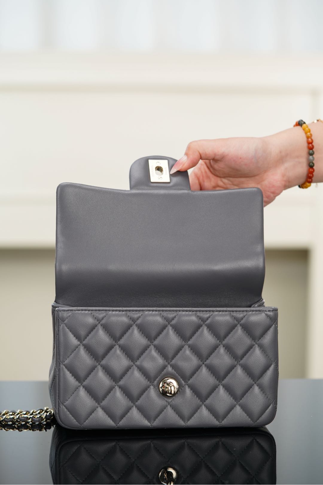 샤넬의 23k 가을겨울 신상 더블 C 핸들 CF 미니백입니다. 깊은 회색의 우아한 색감이 돋보이며, 고급스러운 가죽 소재로 제작되어 세련된 느낌을 줍니다.