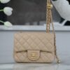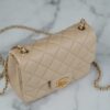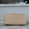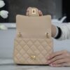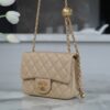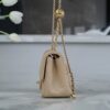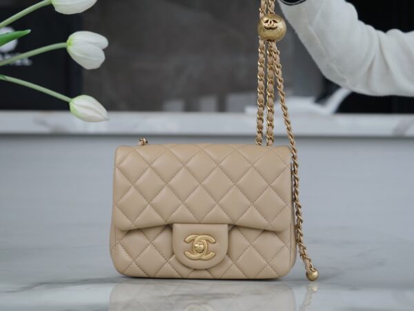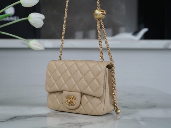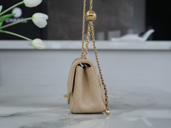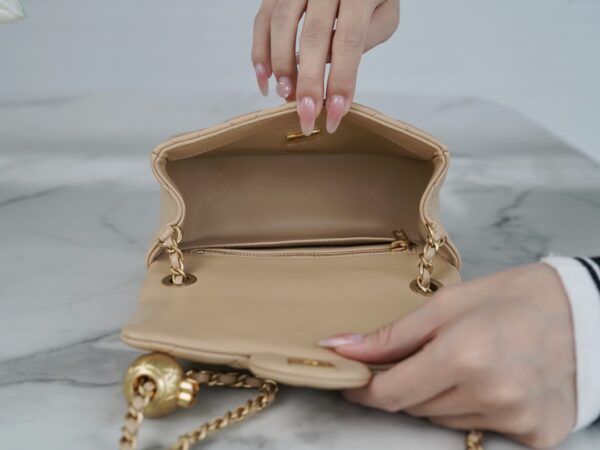 부드러운 아이보리 색상의 샤넬 핸드백으로, 고급스러운 금속 구형 장식이 특징입니다.