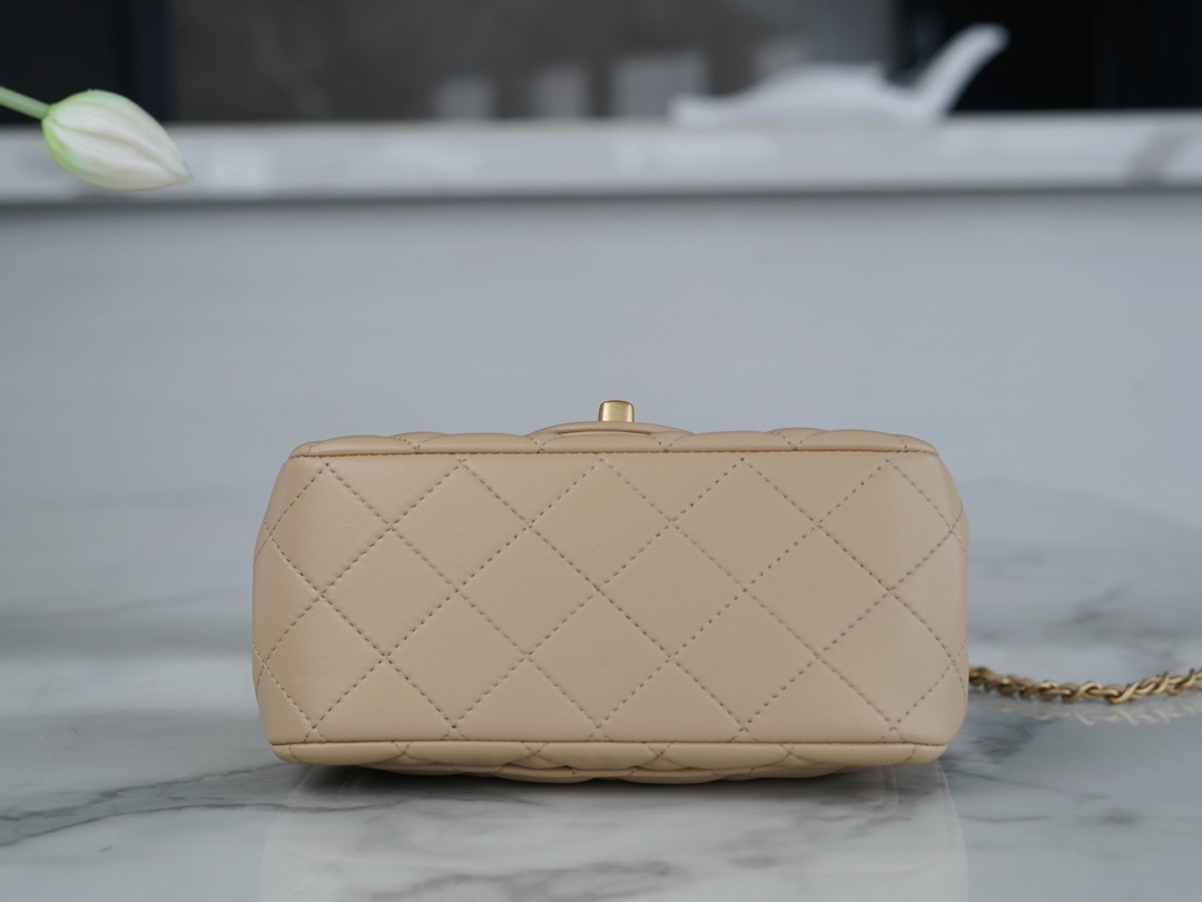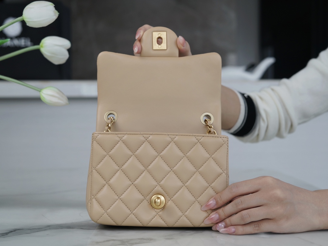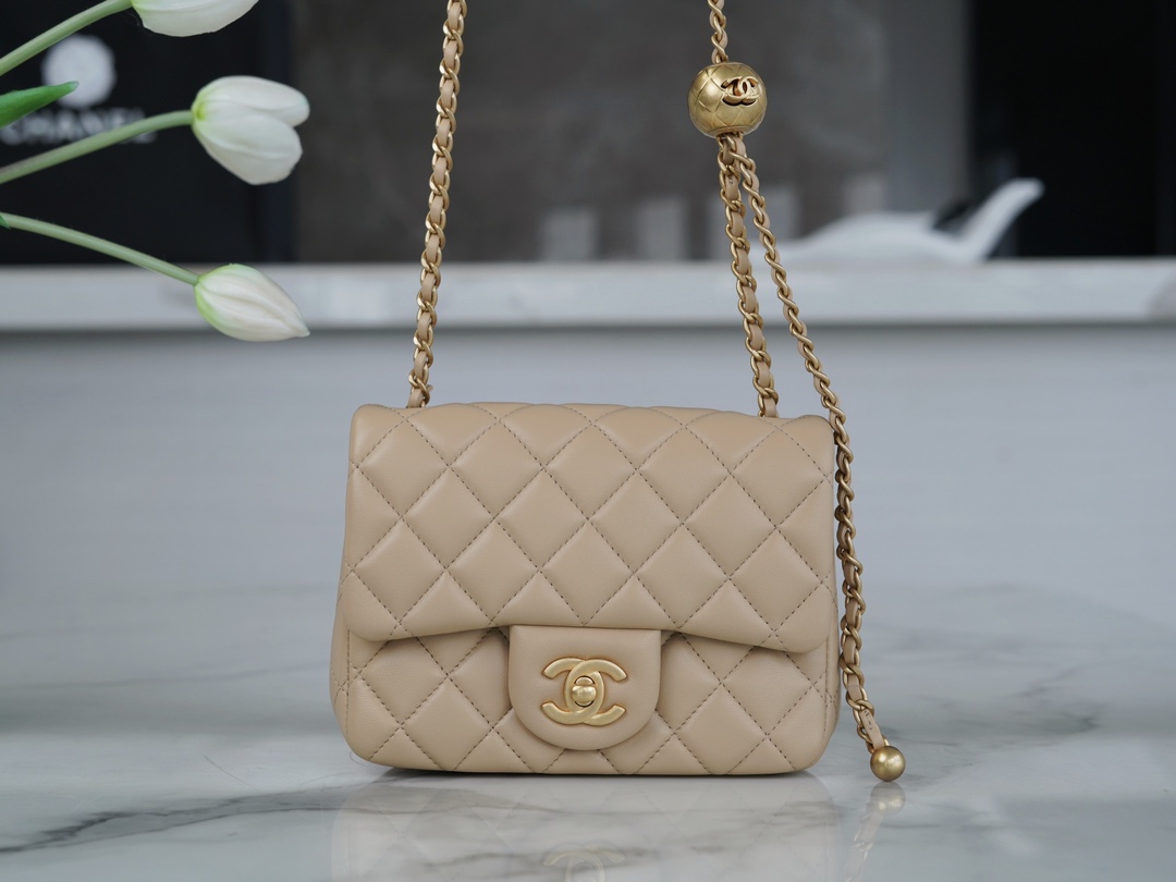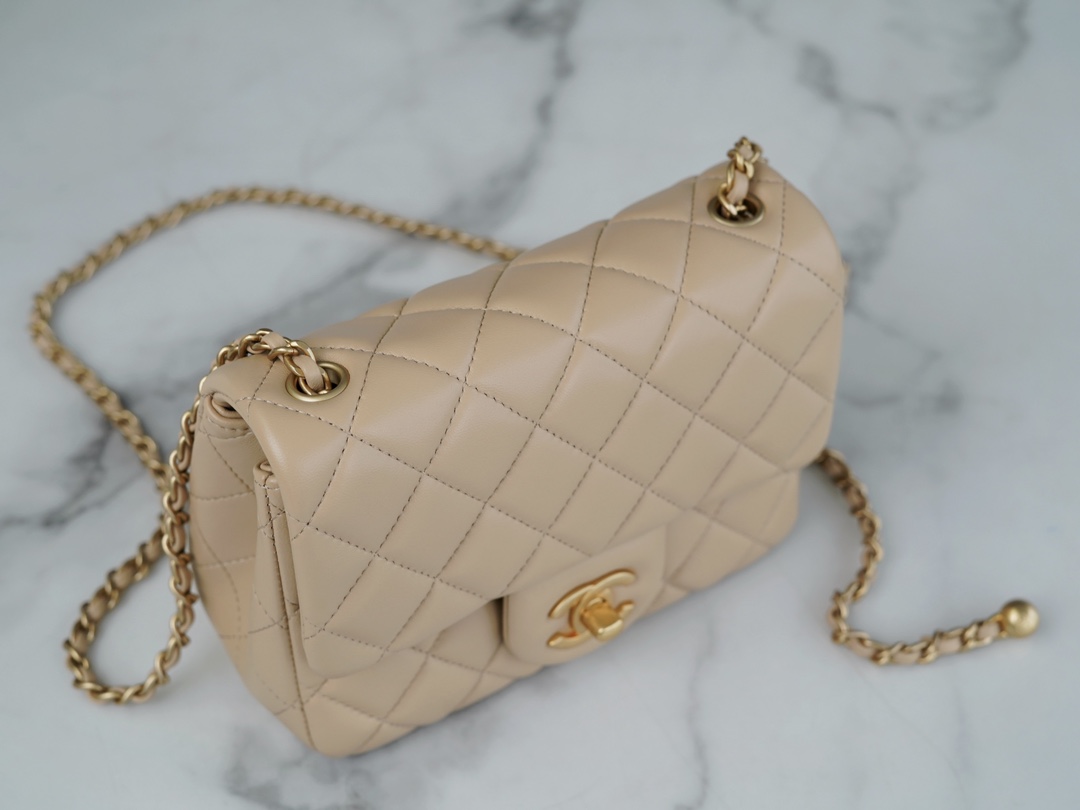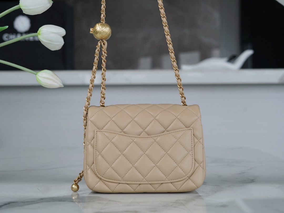 부드러운 아이보리 색상의 샤넬 핸드백으로, 고급스러운 금속 구형 장식이 특징입니다.