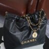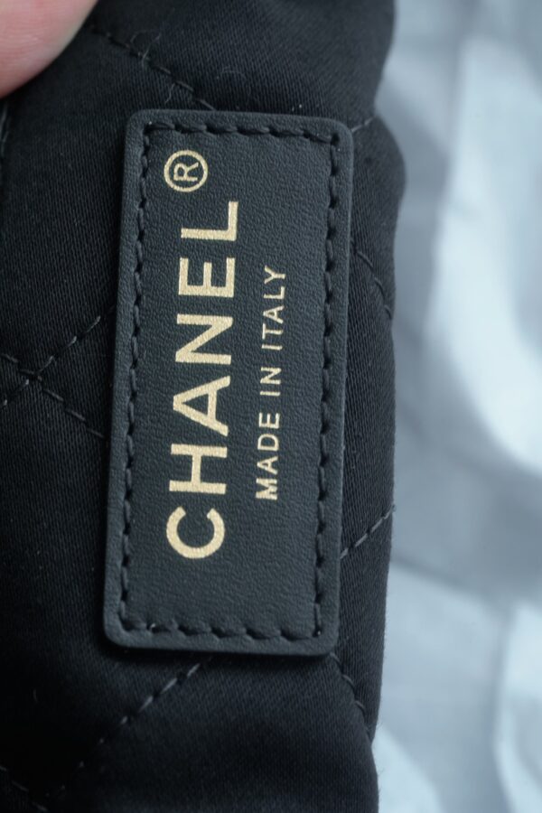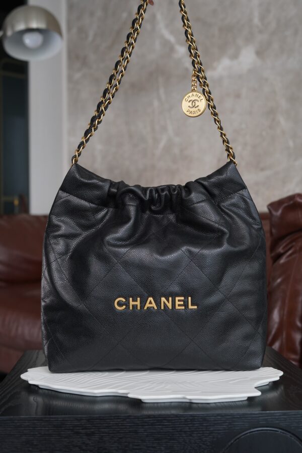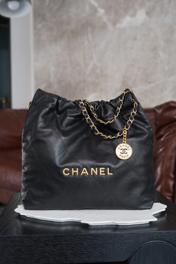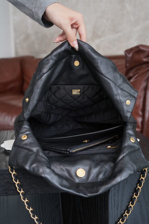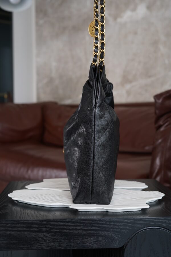 특히, 뚜렷한 샤넬 로고가 장식된 골드 하드웨어가 전체적인 분위기를 한층 끌어올립니다. 빈티지한 감성과 여유로운 실루엣이 매력적인 이 가방은 어떤 룩에도 잘 어울립니다.