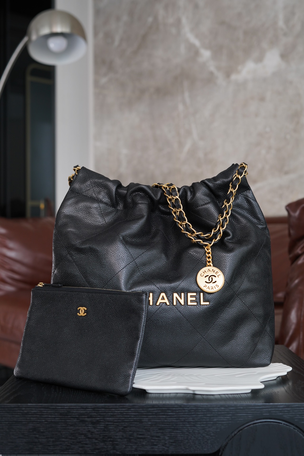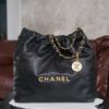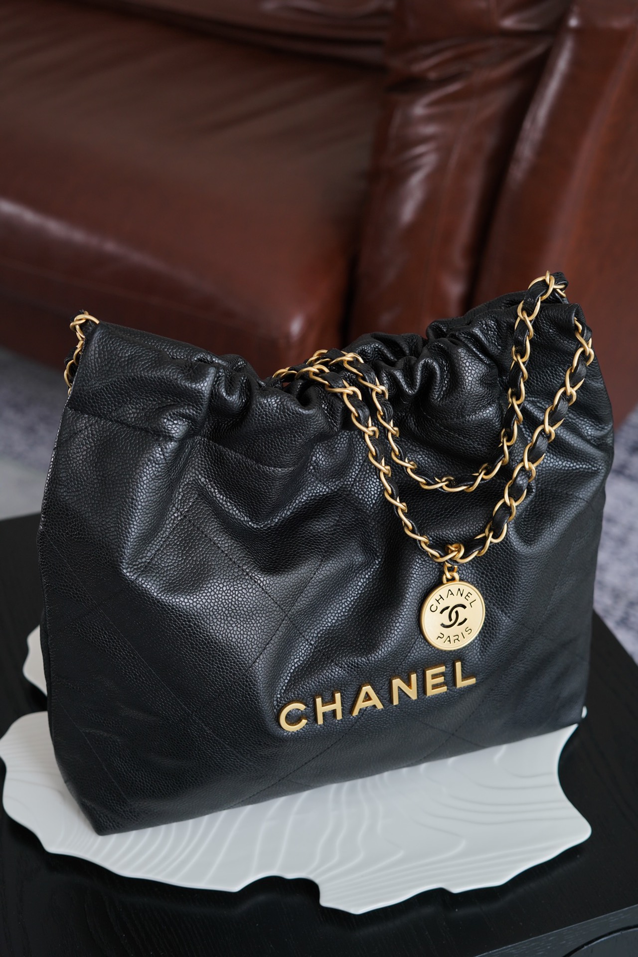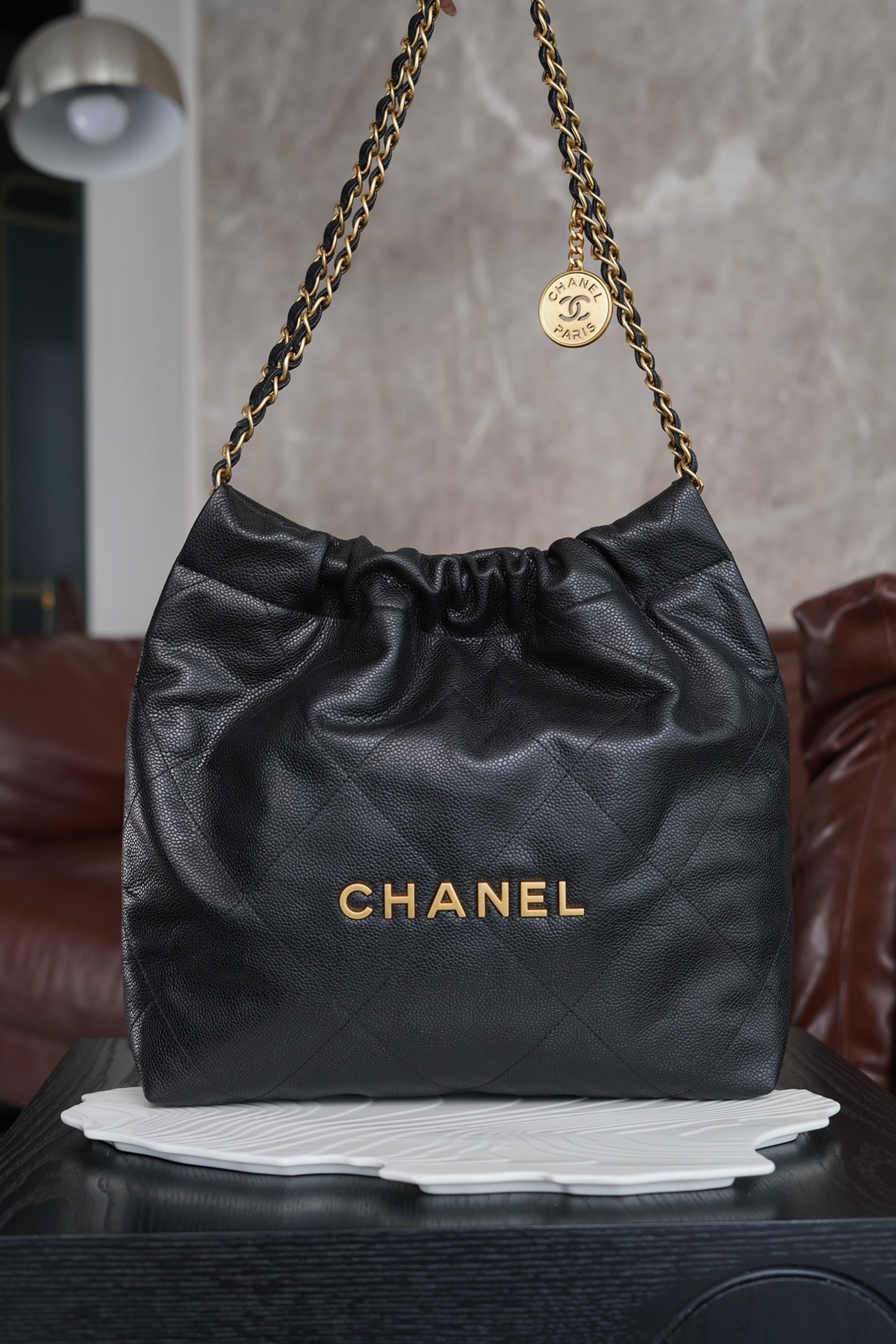 특히, 뚜렷한 샤넬 로고가 장식된 골드 하드웨어가 전체적인 분위기를 한층 끌어올립니다. 빈티지한 감성과 여유로운 실루엣이 매력적인 이 가방은 어떤 룩에도 잘 어울립니다.