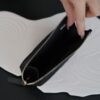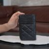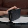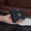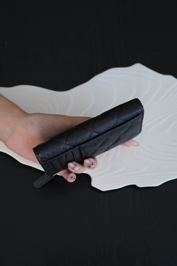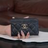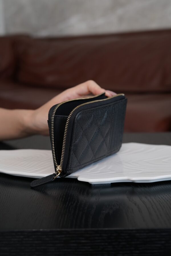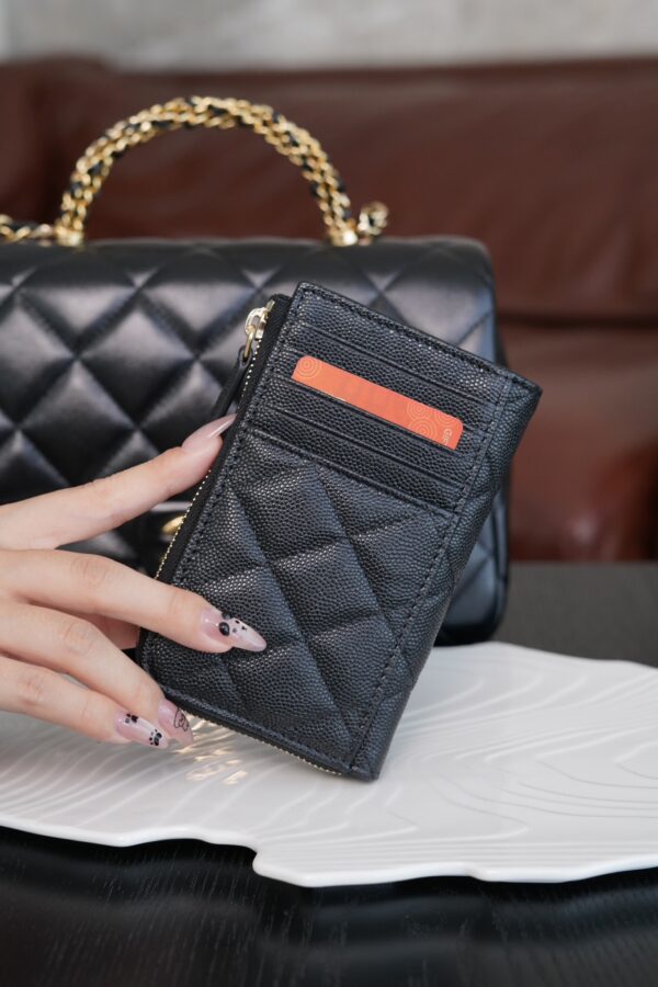 이탈리아산 1급 소가죽으로 제작된 샤넬의 지퍼형 로고 카드 지갑입니다. 세밀한 압축 패턴이 돋보이며, 부드럽고 섬세한 광택이 특징입니다.