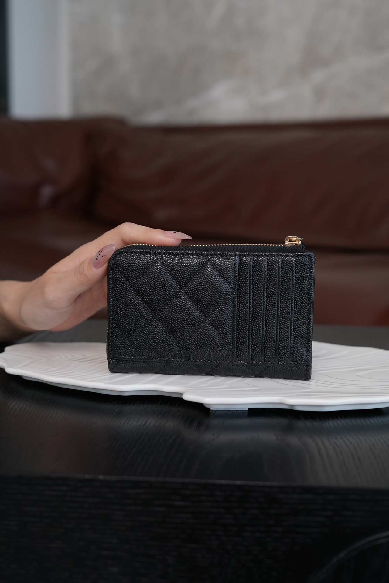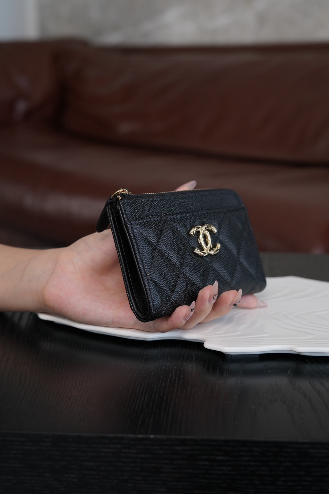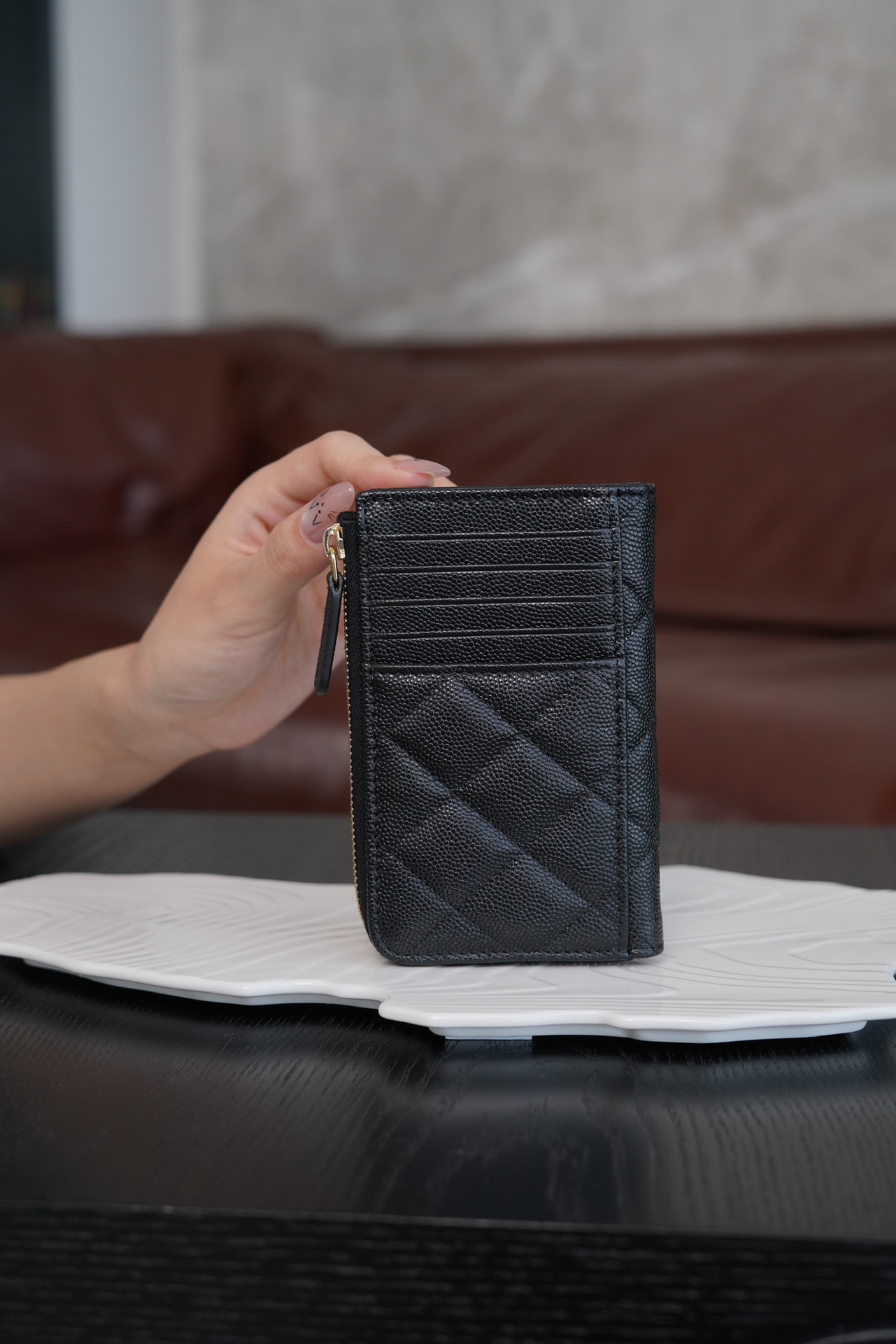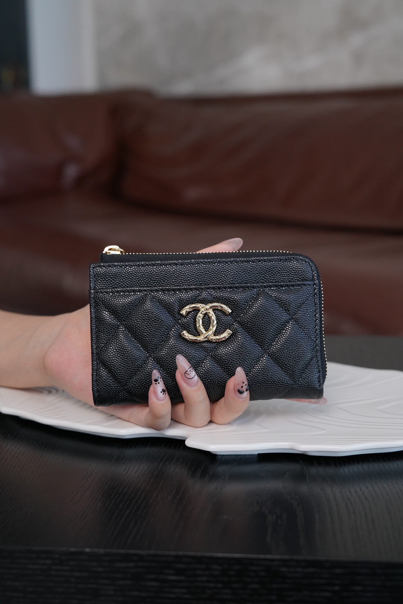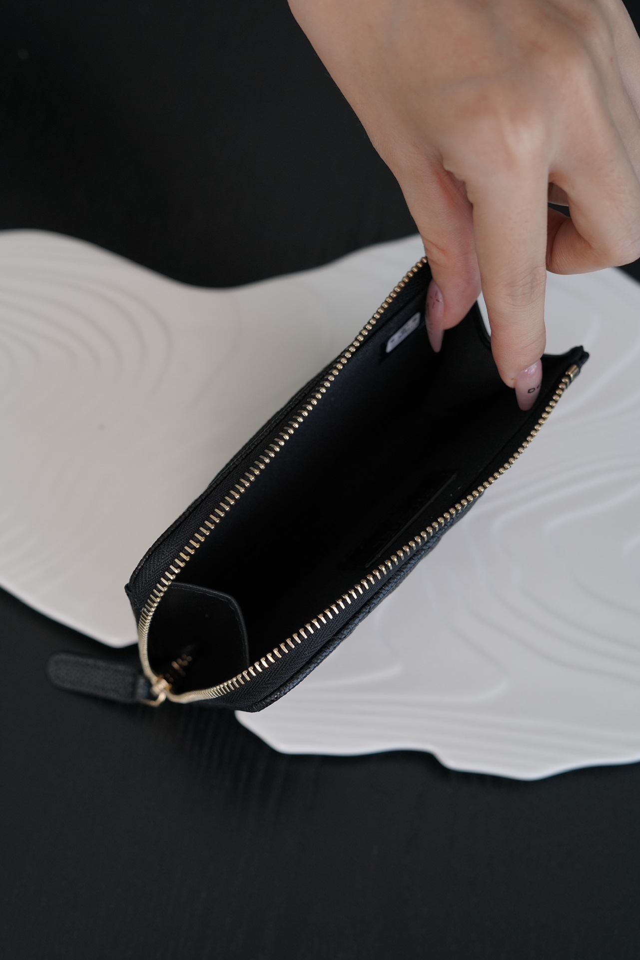 이탈리아산 1급 소가죽으로 제작된 샤넬의 지퍼형 로고 카드 지갑입니다. 세밀한 압축 패턴이 돋보이며, 부드럽고 섬세한 광택이 특징입니다.