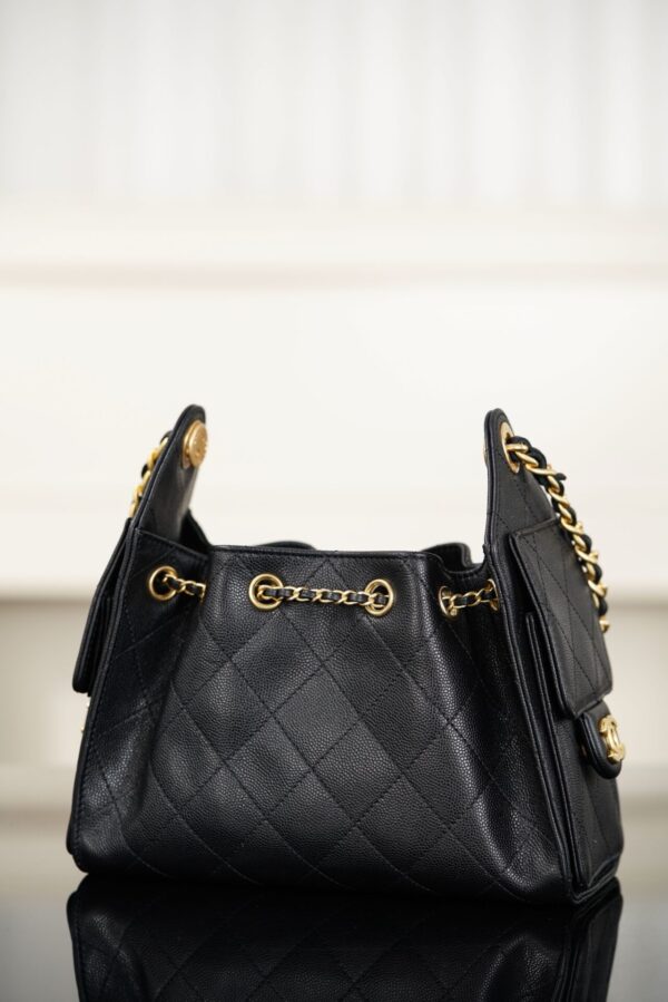 부드러운 캐비어 가죽의 질감이 돋보이며, 빈티지한 느낌의 하드웨어가 조화를 이룹니다. 어깨끈은 충분히 길어 착용 시 편안함을 제공합니다.