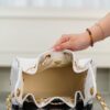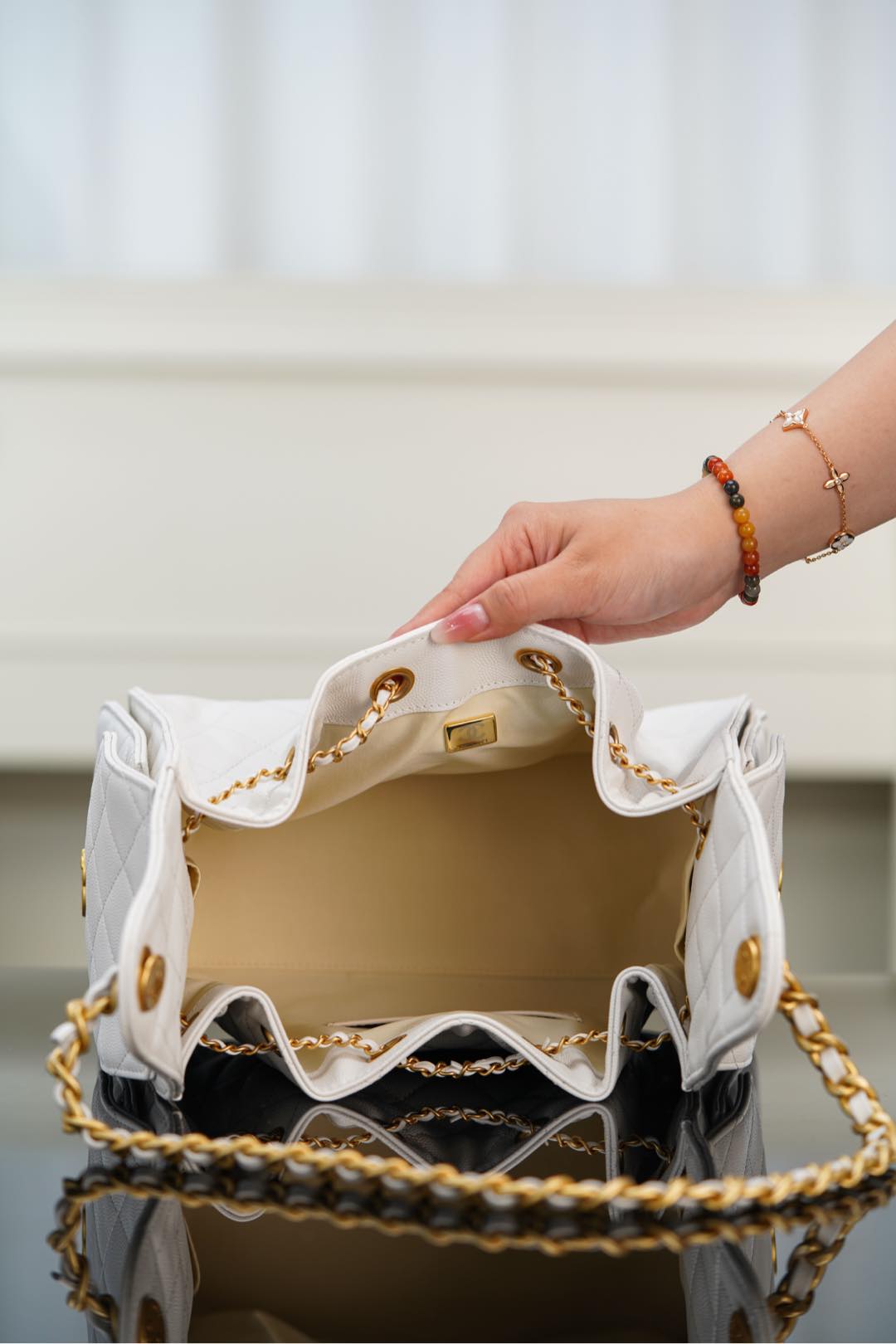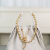 이번 시즌의 핫 아이템, 25 스몰 호보백입니다. 순수한 화이트 컬러가 매력적이며, 고급스러운 캐비어 가죽으로 제작되어 세련된 느낌을 줍니다.