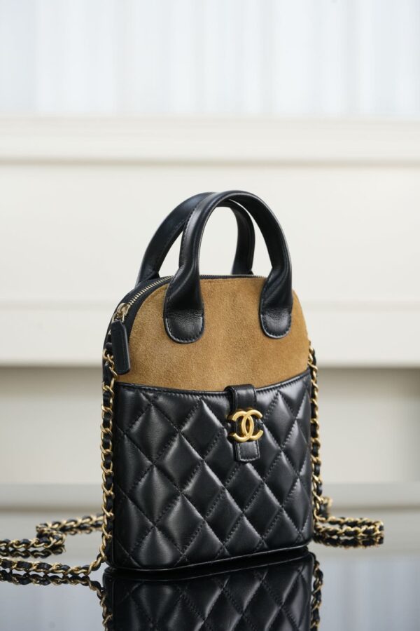 부드러운 스웨이드와 가죽 조합으로 고급스러운 질감을 자랑합니다. 앞면의 더블 C 로고가 포인트로, 실용적인 작은 수납 공간이 마련되어 있어 편리합니다.
