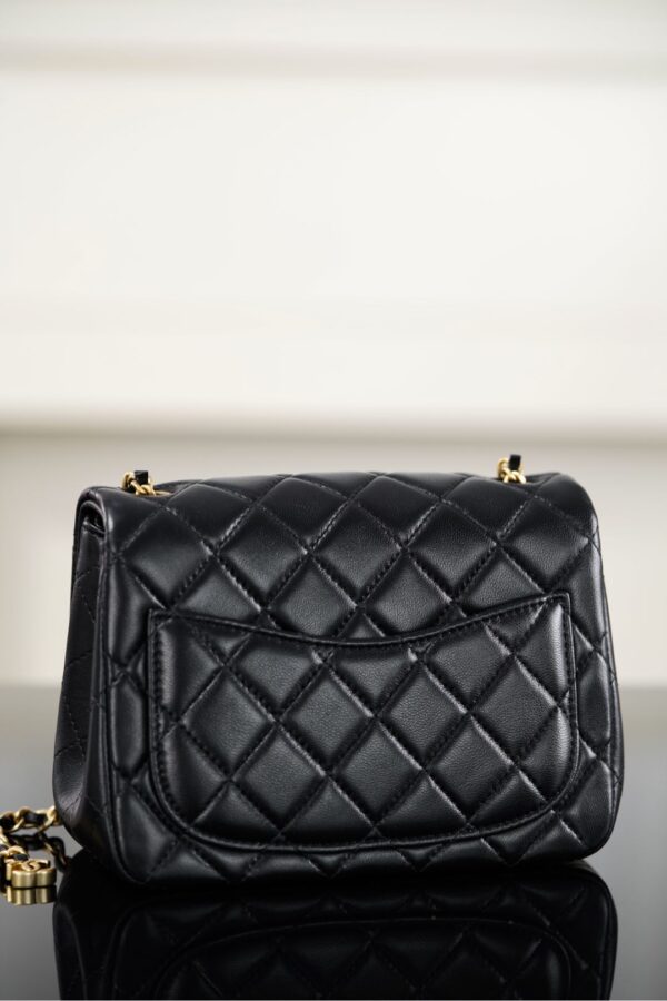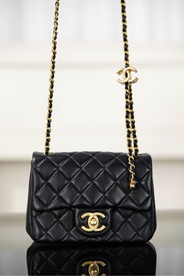 샤넬의 25B 미니백은 우아한 블랙 양가죽으로 제작되어 부드러운 촉감을 자랑합니다.