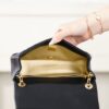 내부는 금색의 부드러운 가죽으로 마감되어 있으며, 스마트폰과 일상 용품을 충분히 수납할 수 있는 공간을 제공합니다.