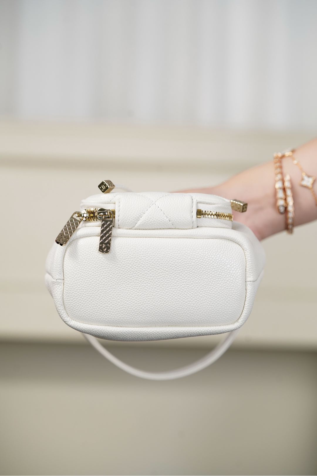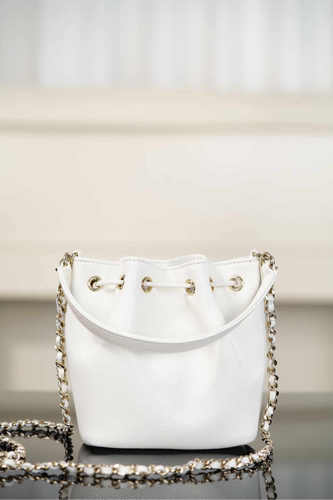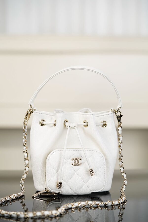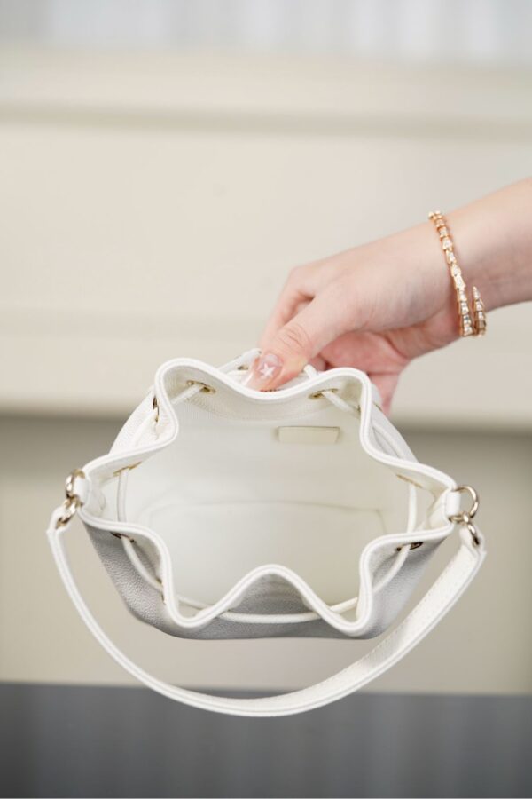 이 미니 버킷백은 작고 아담한 디자인으로, 클래식한 화이트 컬러가 고급스러움을 더합니다.