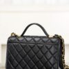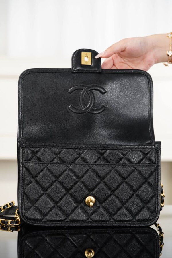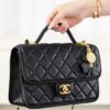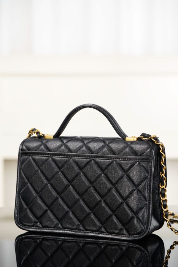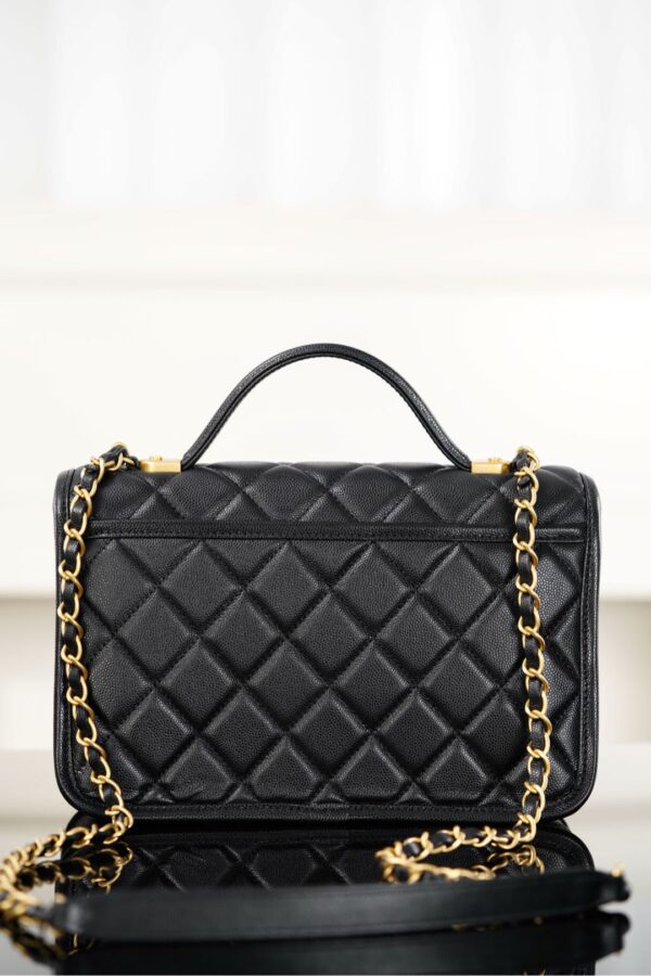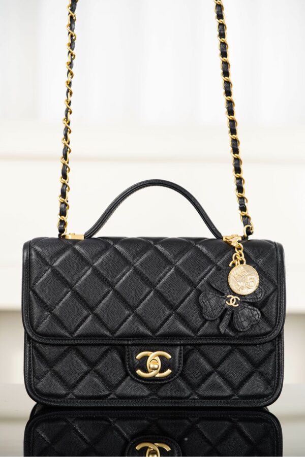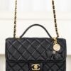 디자인 포인트로는 샤넬의 상징적인 골드 장식이 돋보이며, 사브르 골드의 독특한 매력이 더해져 세련된 분위기를 연출합니다. 손잡이와 체인 스트랩이 있어 다양한 착용 방식으로 활용할 수 있습니다.