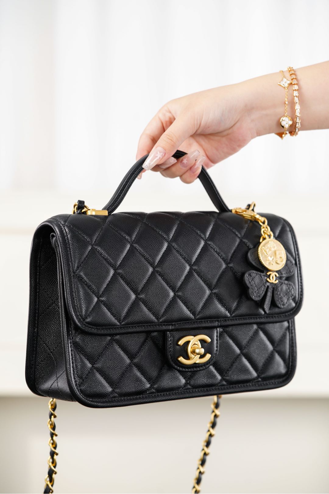 디자인 포인트로는 샤넬의 상징적인 골드 장식이 돋보이며, 사브르 골드의 독특한 매력이 더해져 세련된 분위기를 연출합니다. 손잡이와 체인 스트랩이 있어 다양한 착용 방식으로 활용할 수 있습니다.