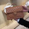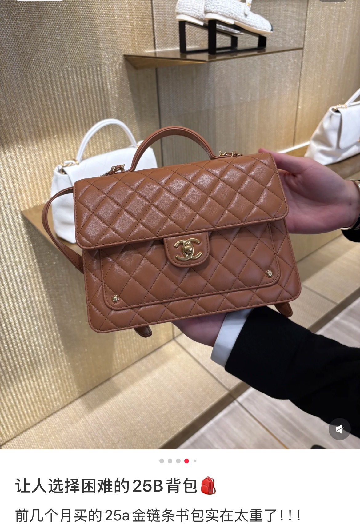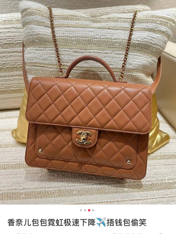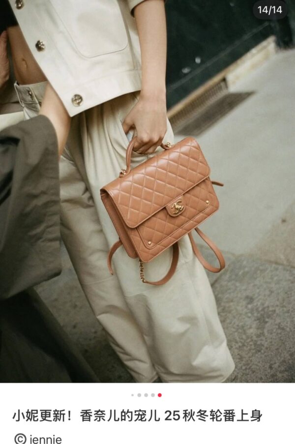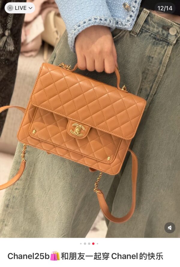 부드러운 양가죽 소재로 제작된 샤넬 25B 백팩은 고급스러운 카멜 색상이 매력적입니다.