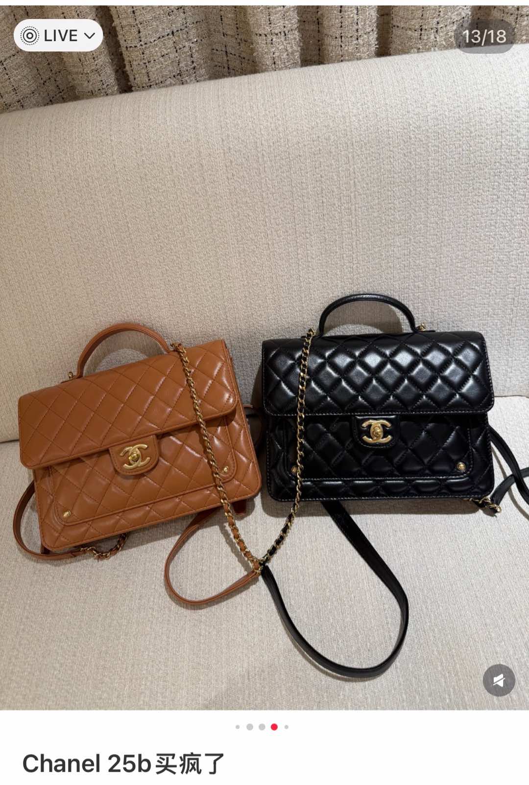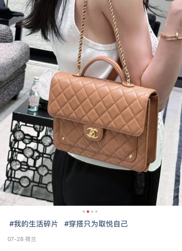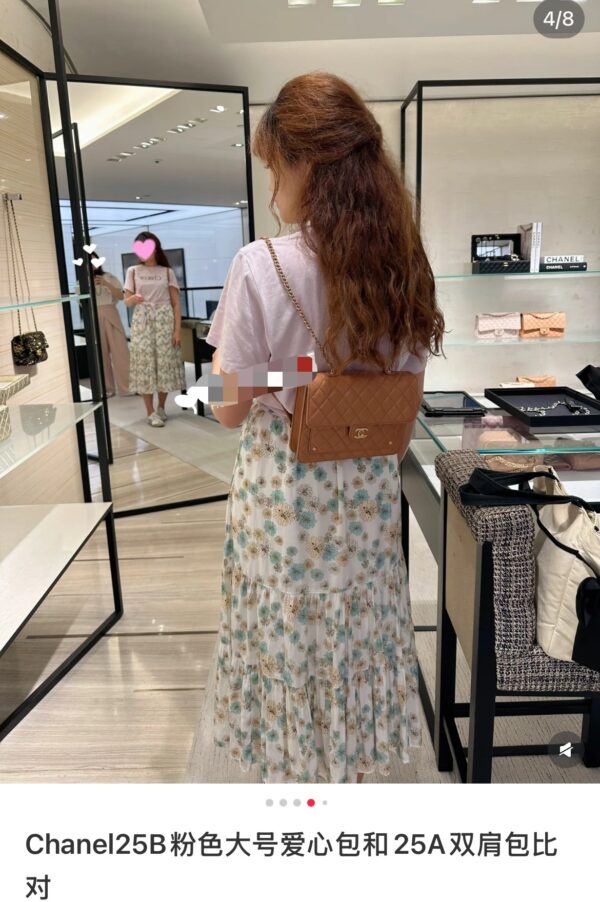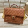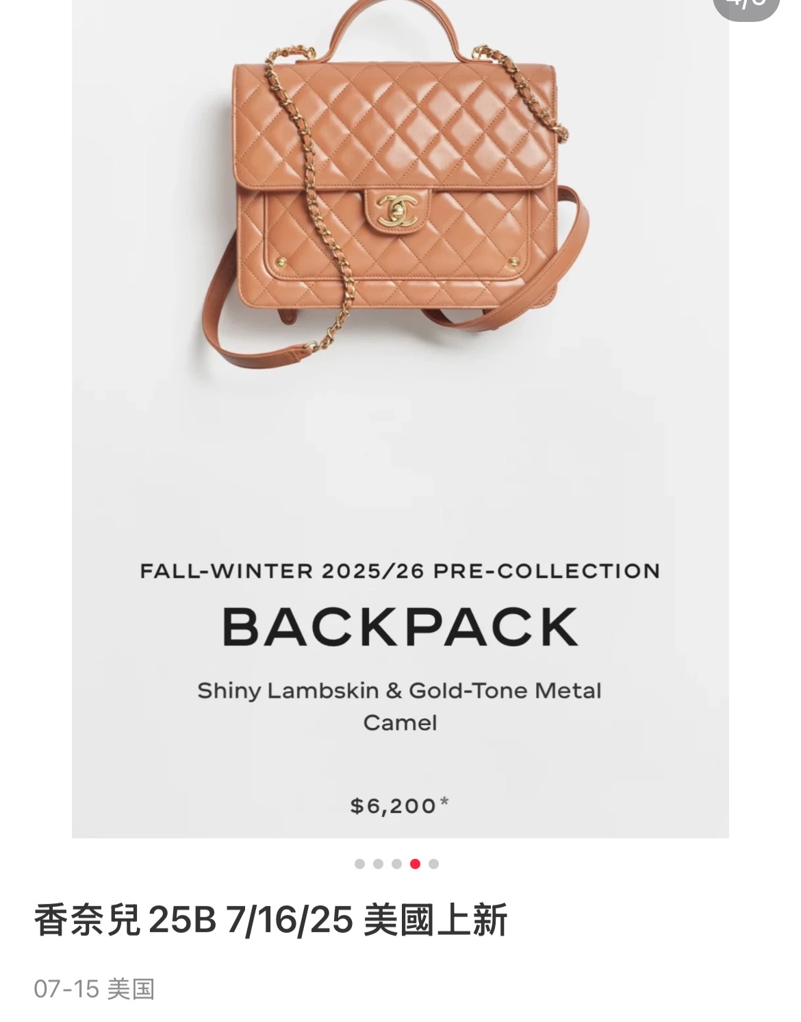 부드러운 양가죽 소재로 제작된 샤넬 25B 백팩은 고급스러운 카멜 색상이 매력적입니다.