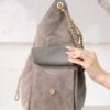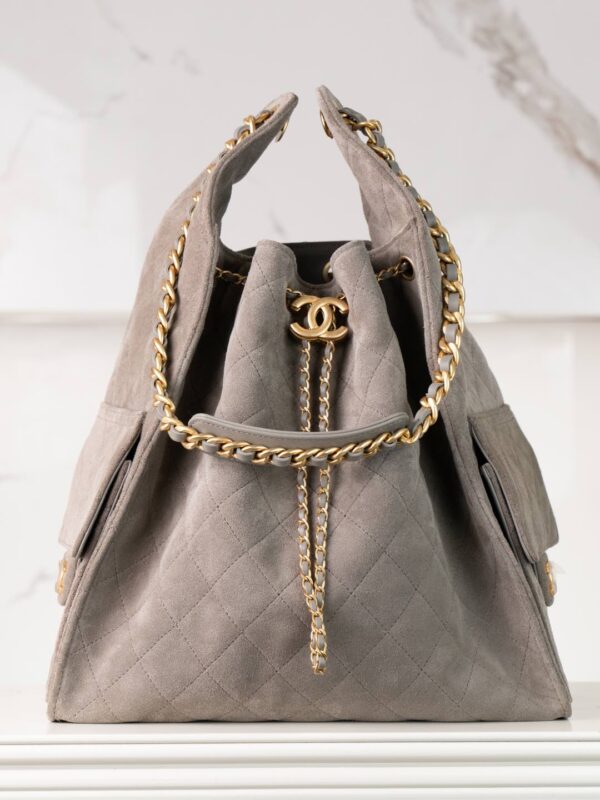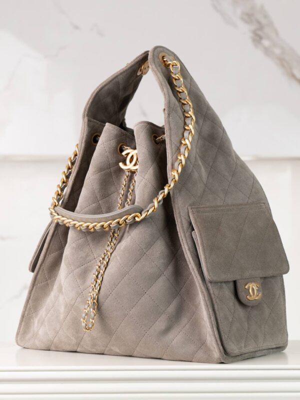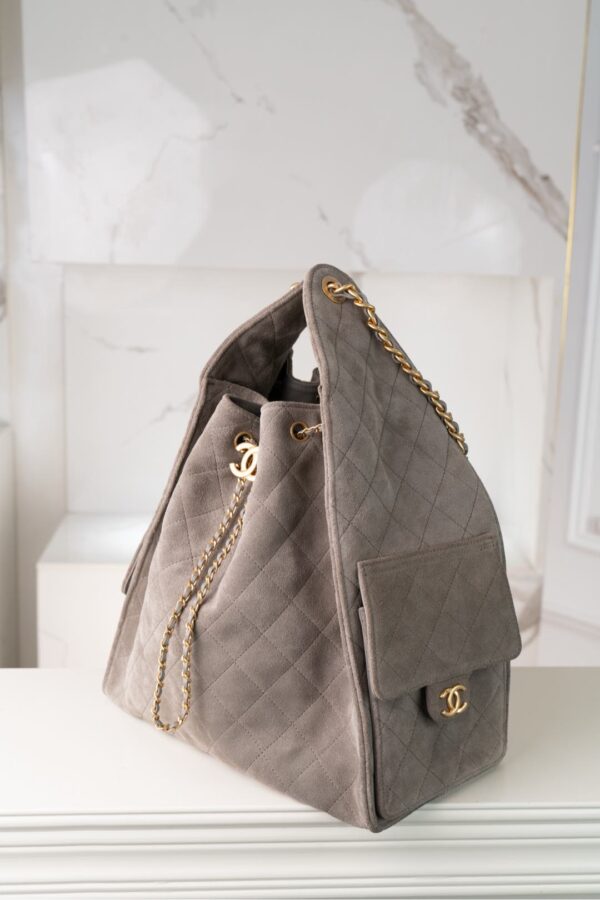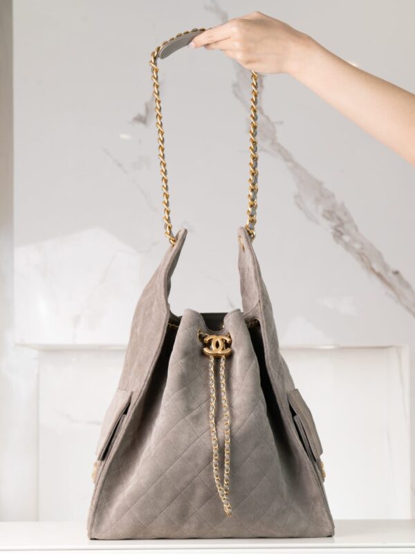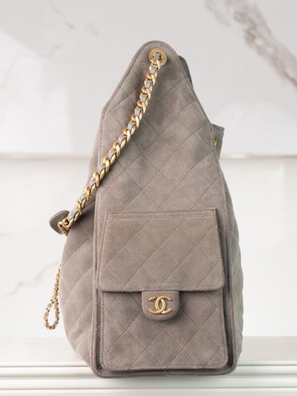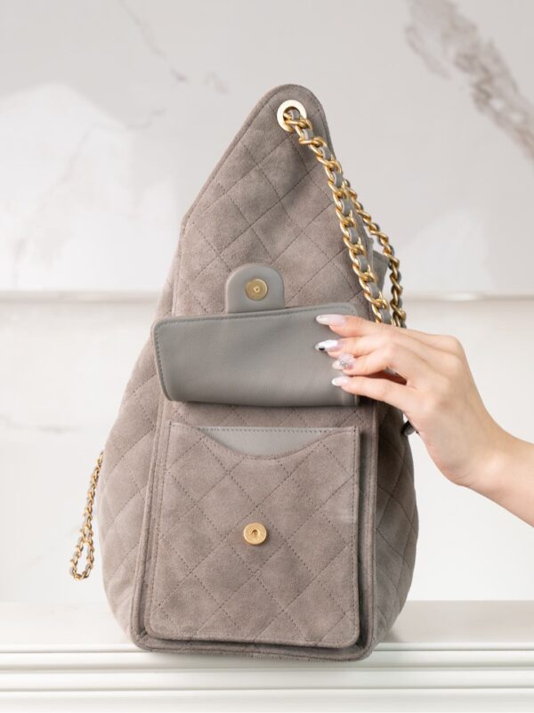 부드럽고 섬세한 스웨이드 소재로 제작된 이 호보백은 추리닝 스타일의 물통백입니다.