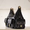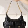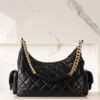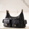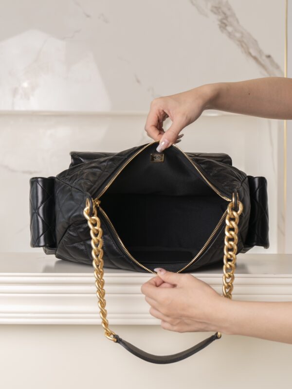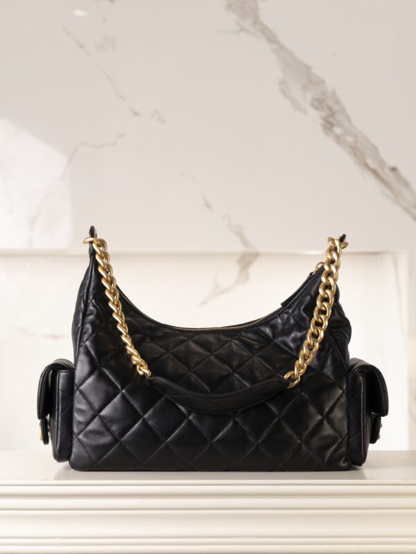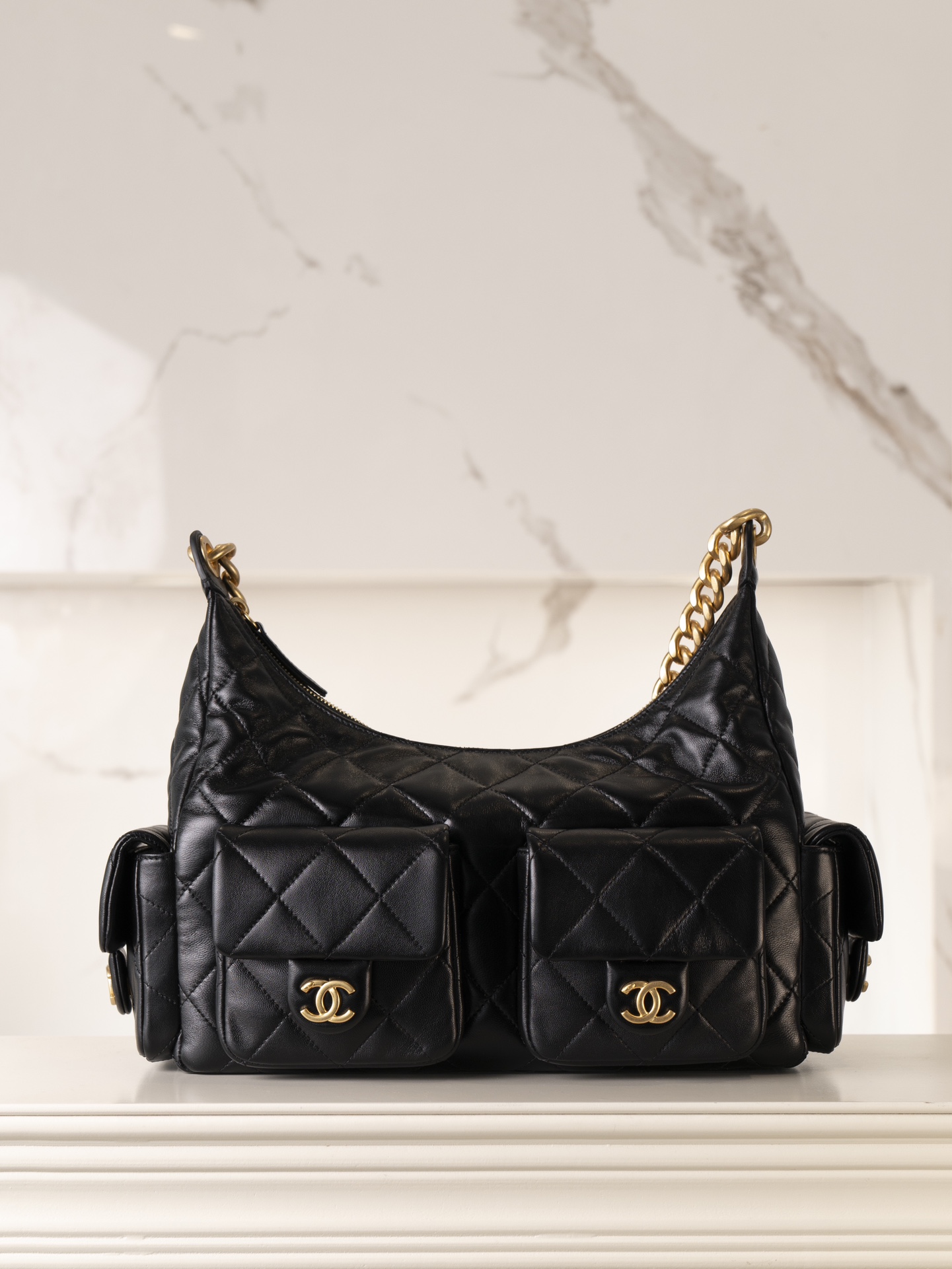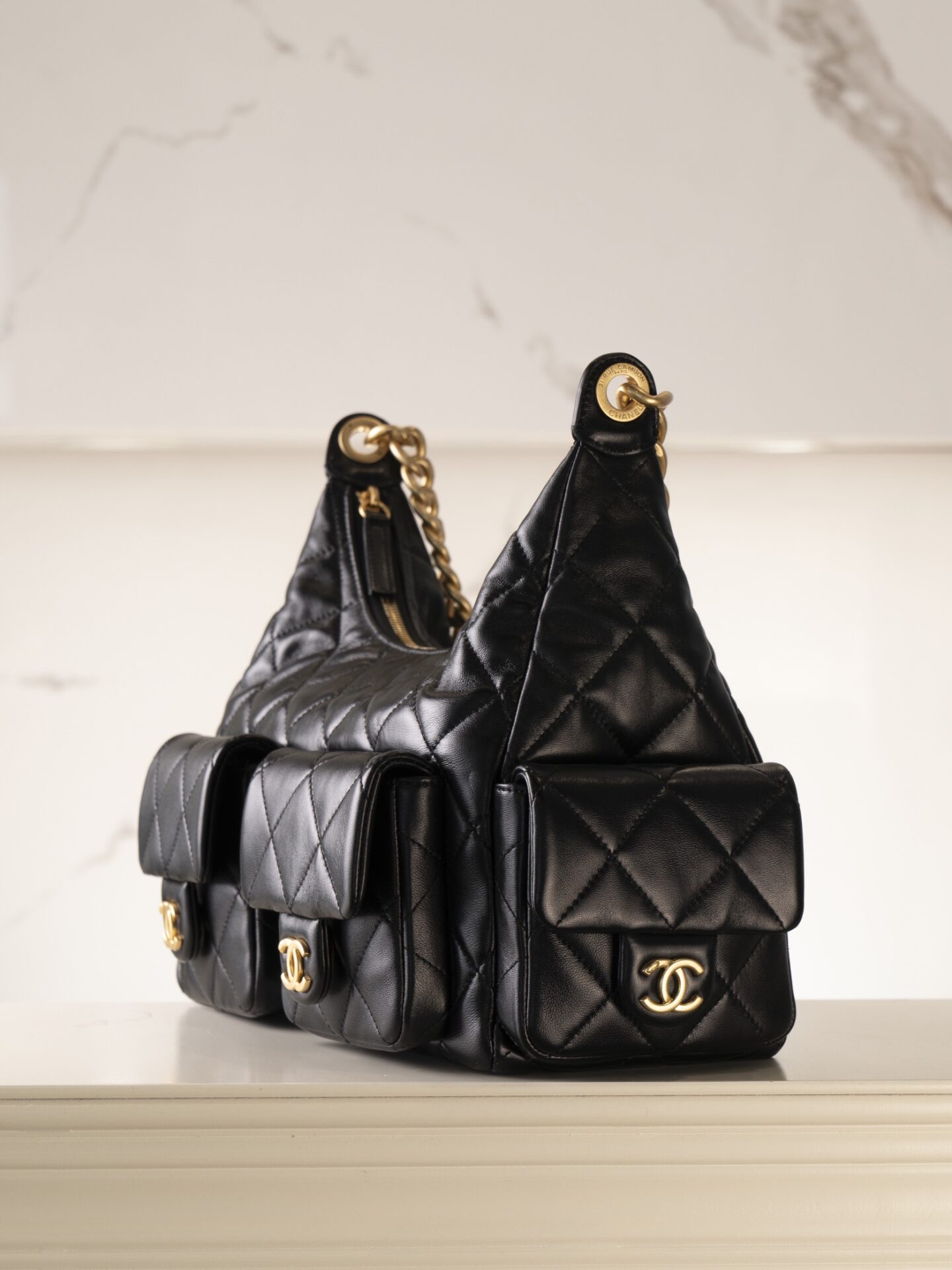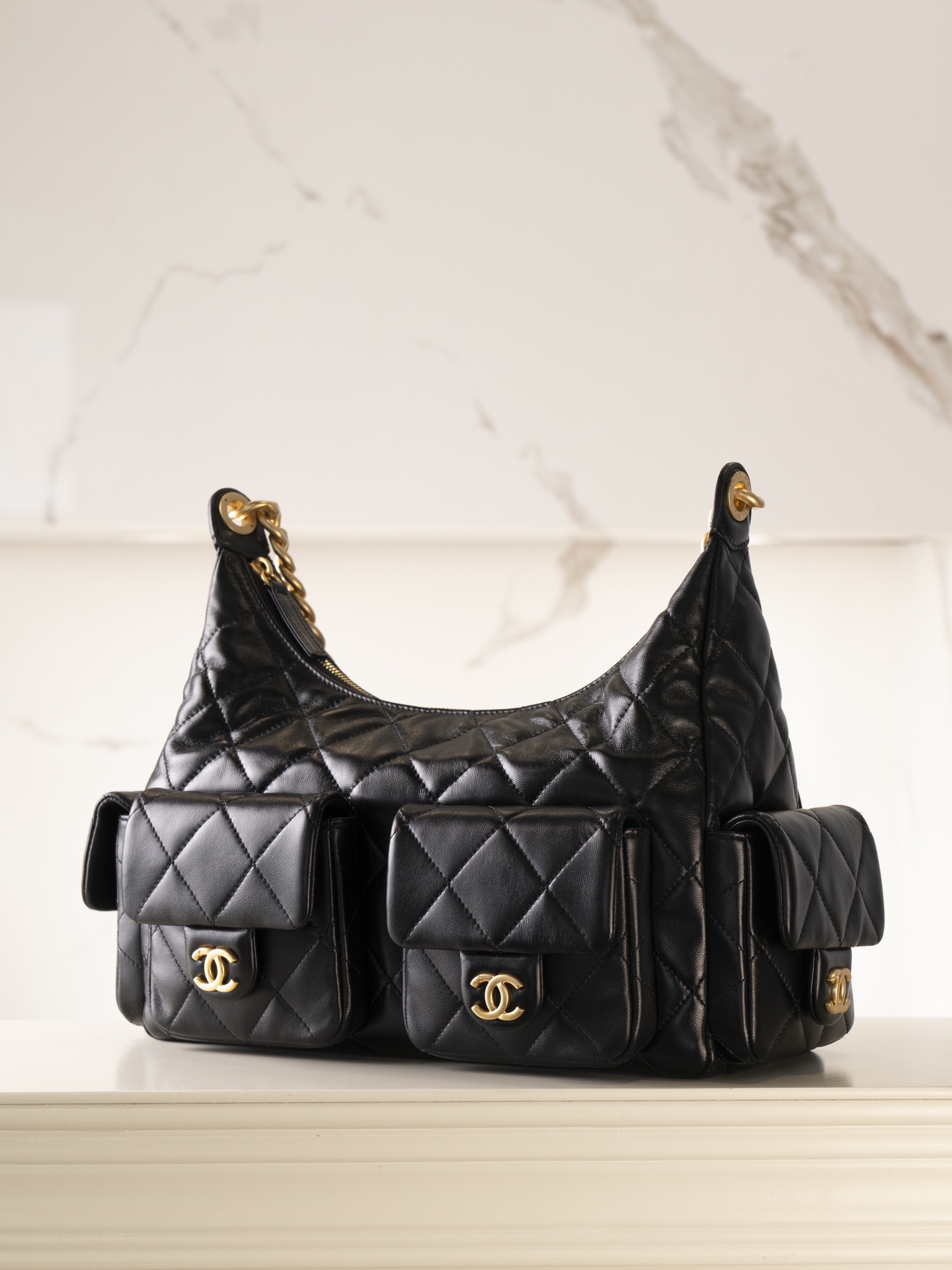 샤넬의 대형 히피 호보 백은 블랙 색상으로 클래식한 매력을 자아냅니다.