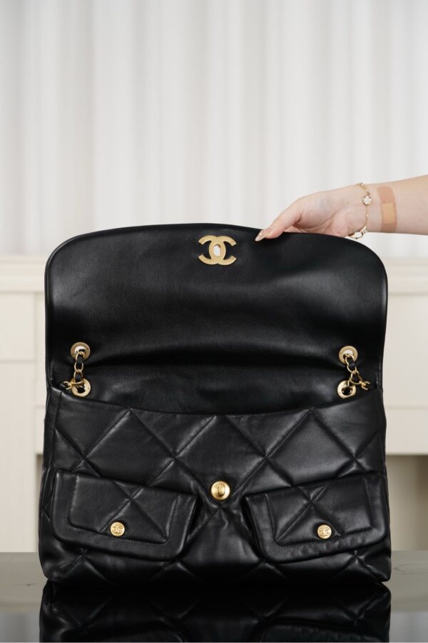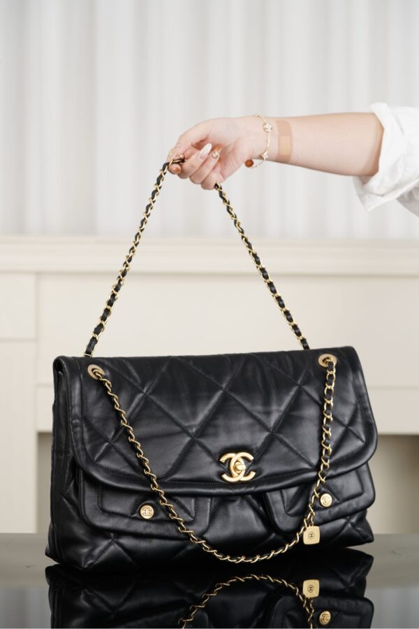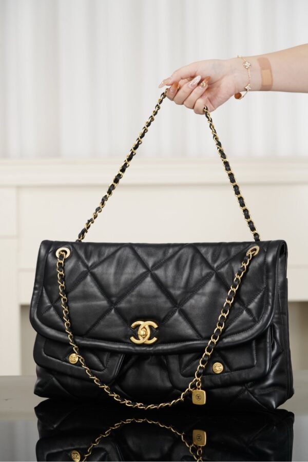 클래식한 대각선 패턴의 플랩백으로, 두 개의 포켓 디자인이 돋보입니다.