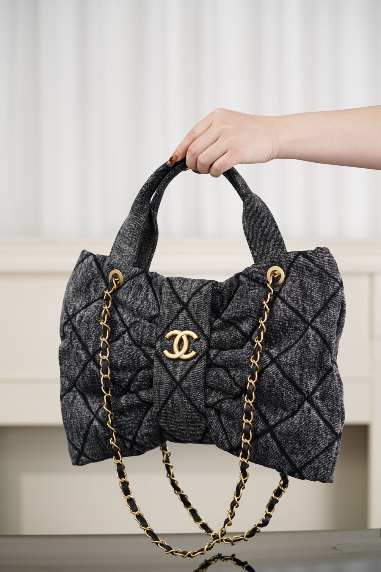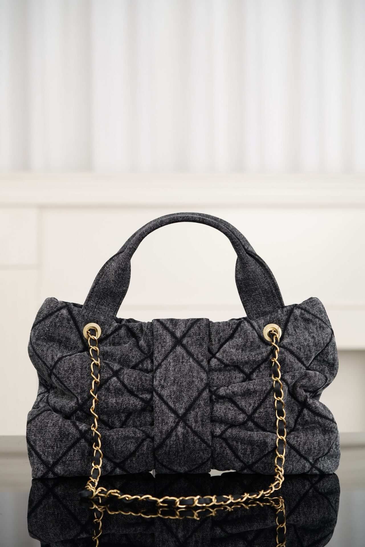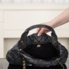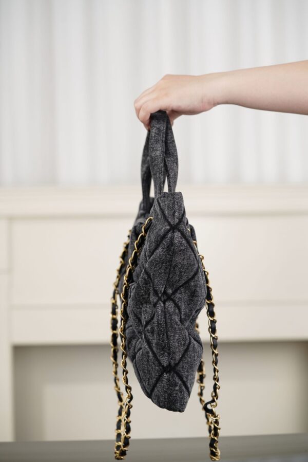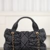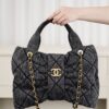 블랙 데님 소재로 제작되어 캐주얼하면서도 세련된 느낌을 줍니다. 고급스러운 퀼팅 디자인이 특징이며, 다양한 스타일에 잘 어울립니다.
