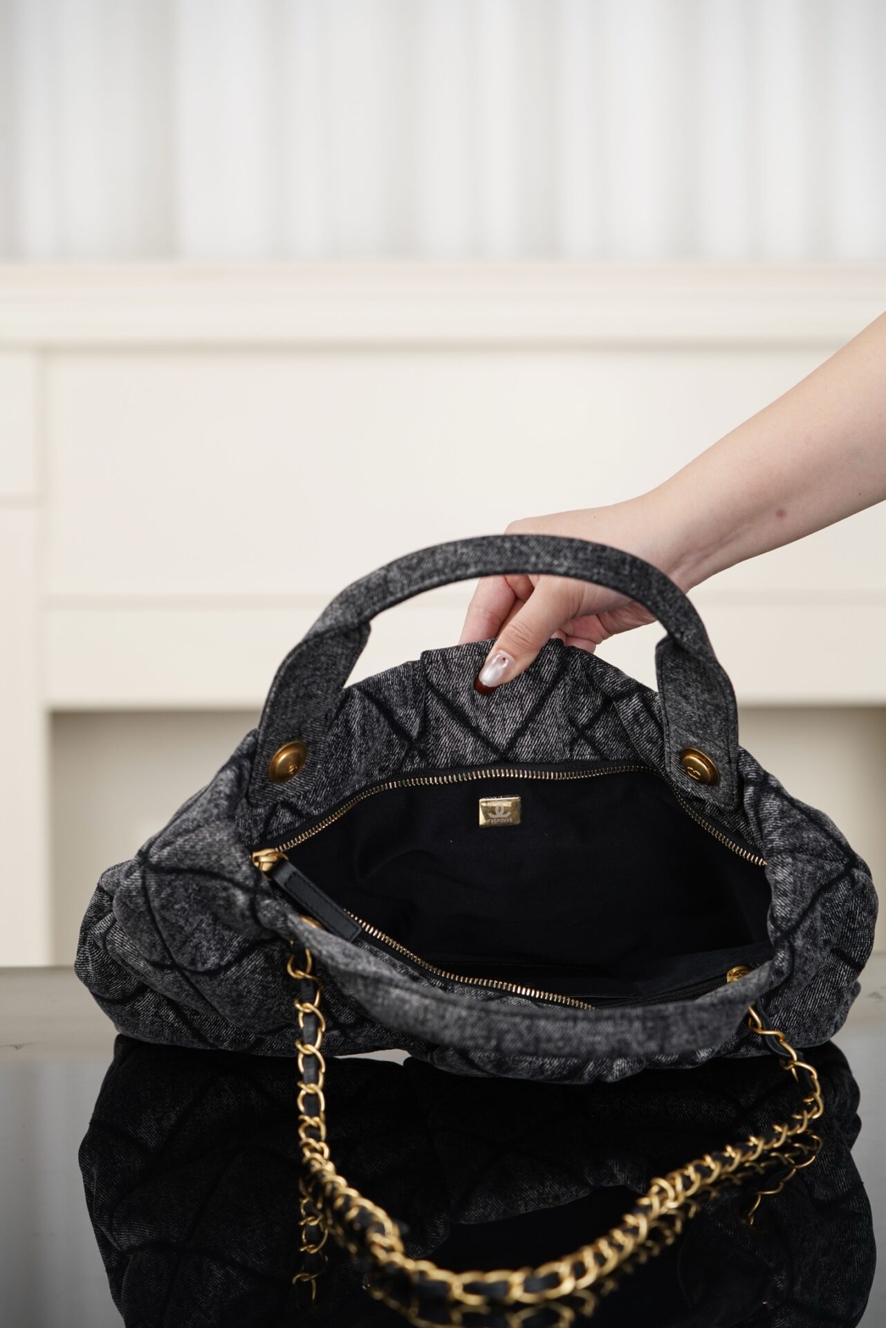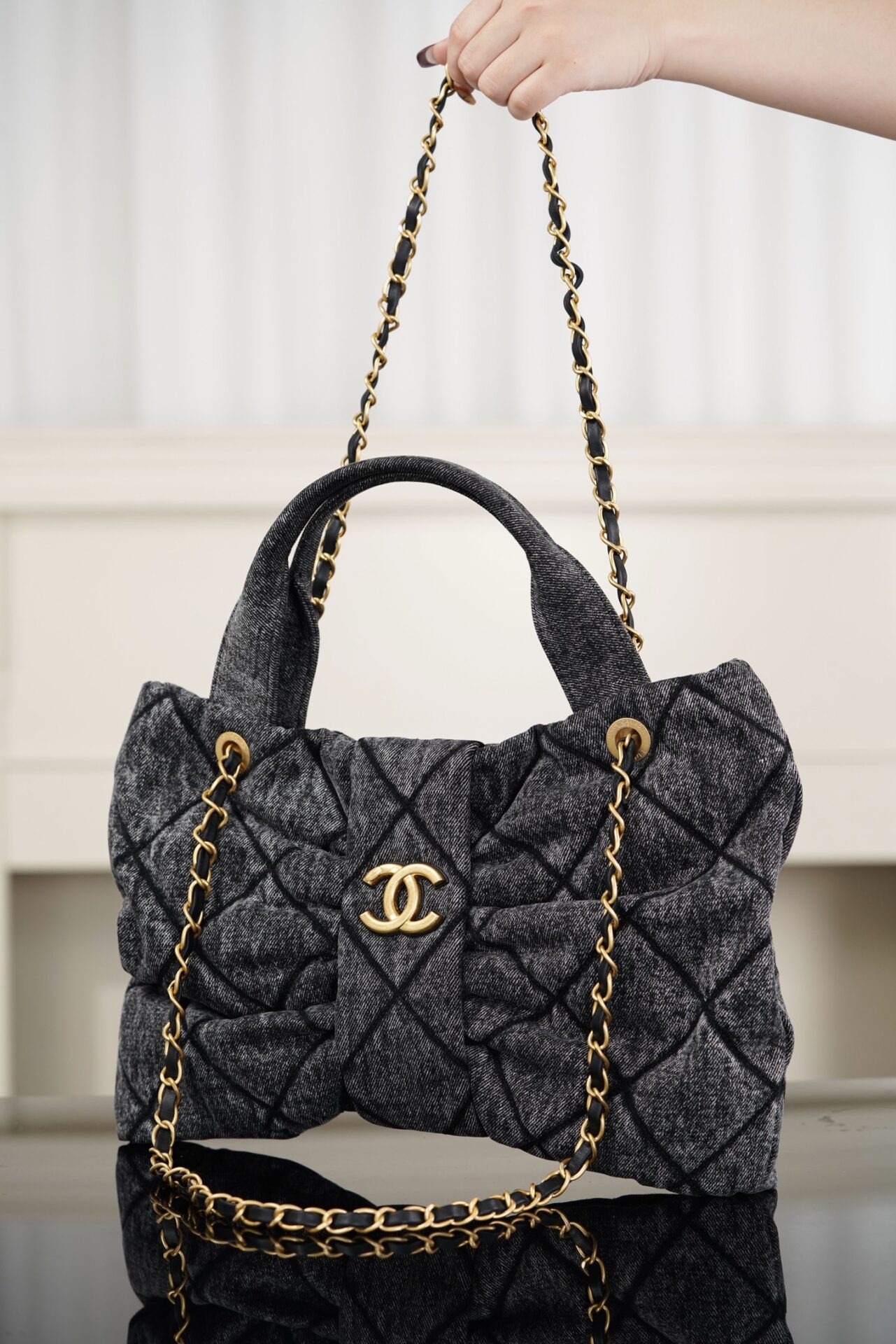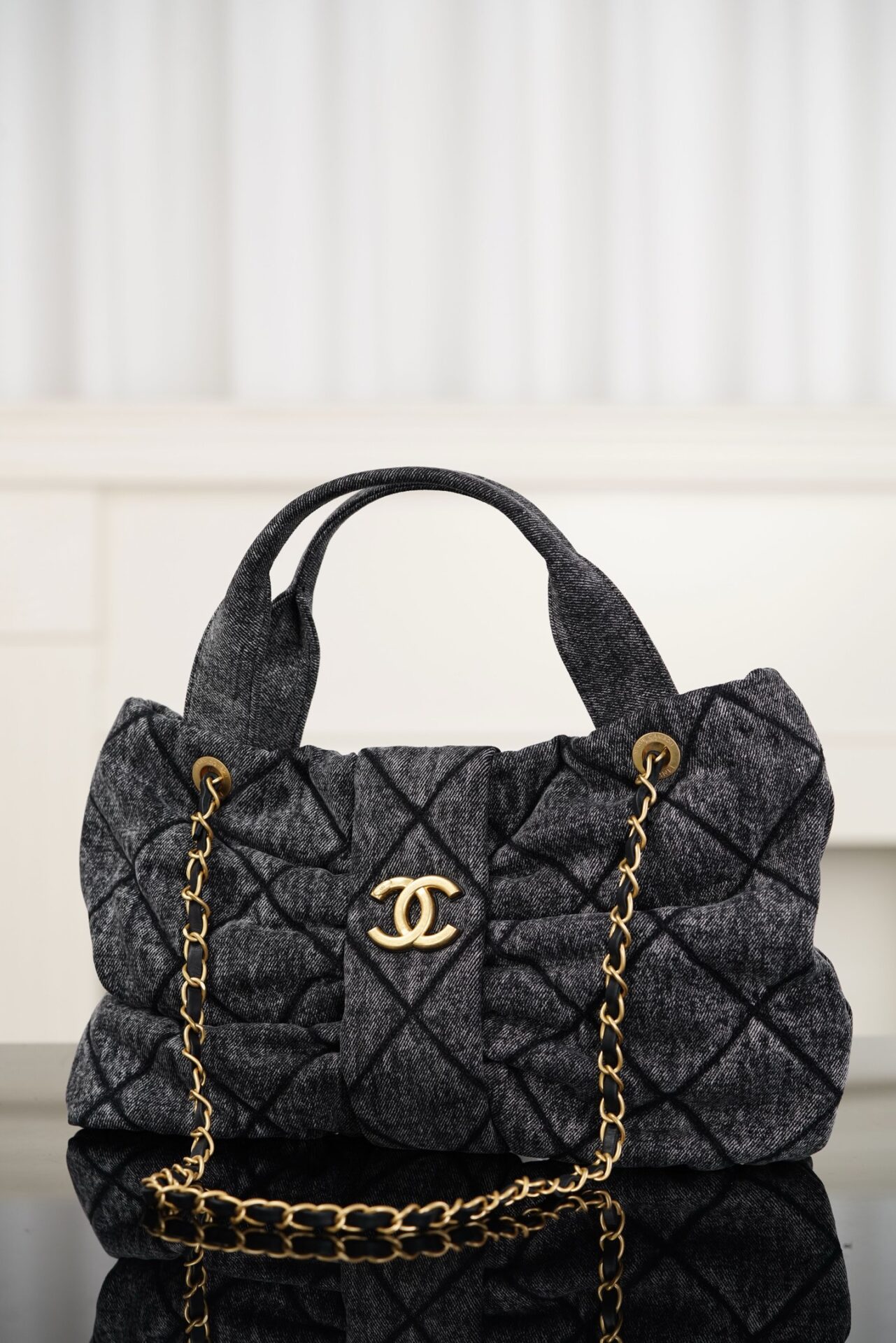블랙 데님 소재로 제작되어 캐주얼하면서도 세련된 느낌을 줍니다. 고급스러운 퀼팅 디자인이 특징이며, 다양한 스타일에 잘 어울립니다.