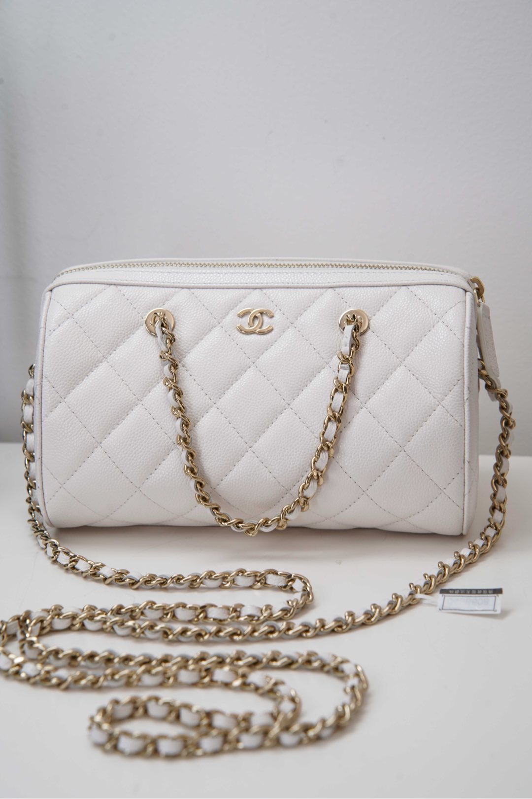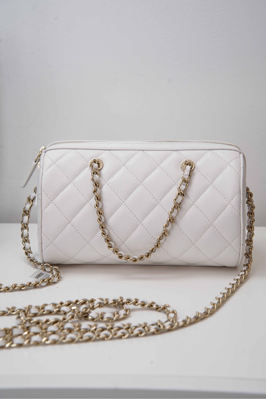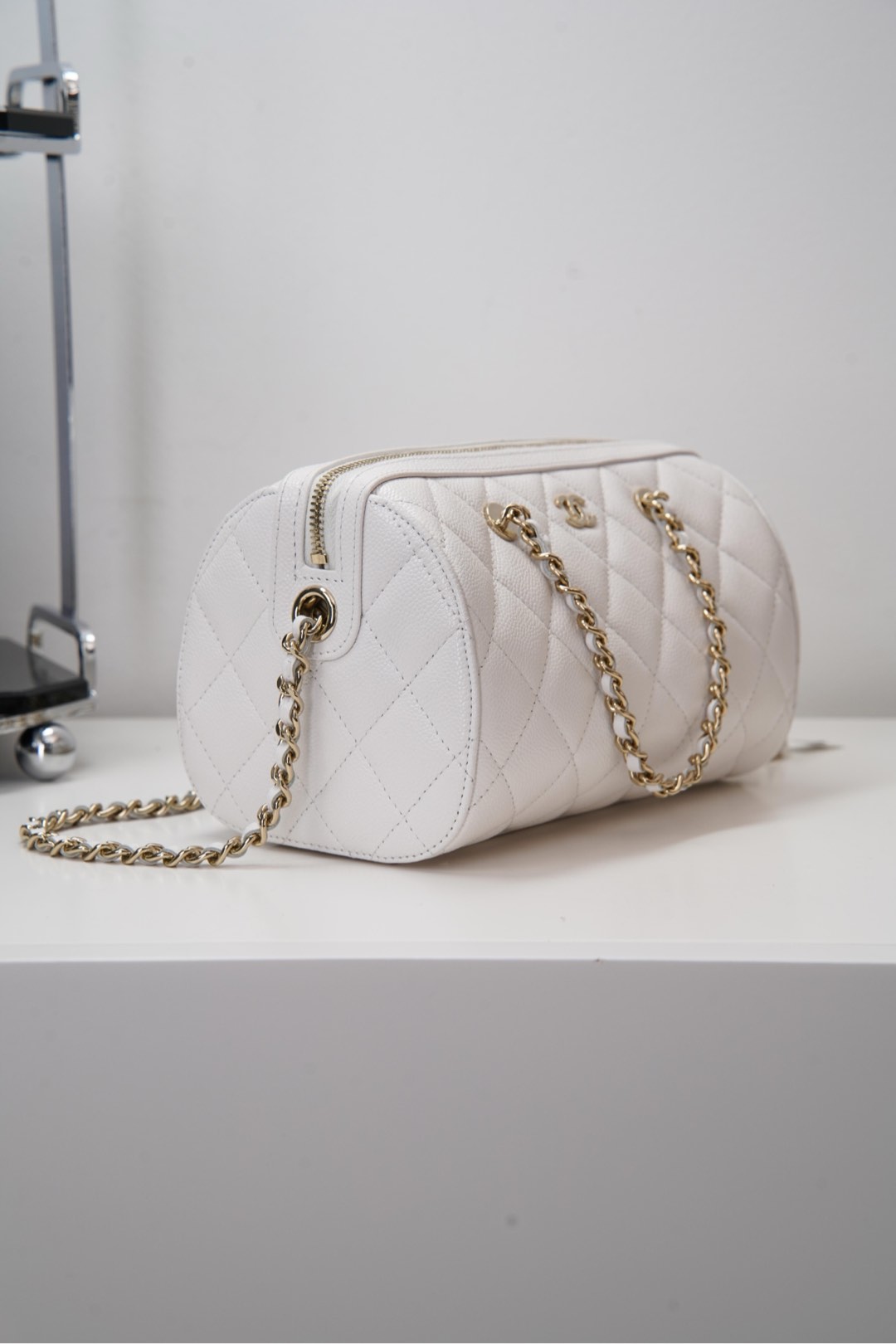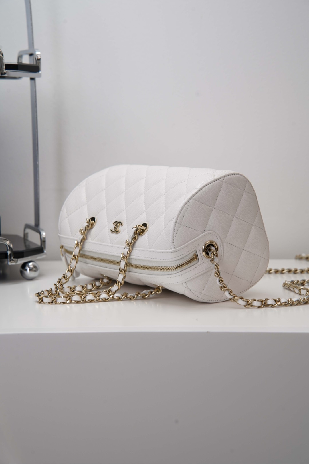작지만 넉넉한 수납 공간을 제공하며, 손으로 들거나 어깨에 걸쳐 착용할 수 있습니다. 분리 가능한 긴 체인 스트랩으로 다양한 스타일링이 가능합니다.