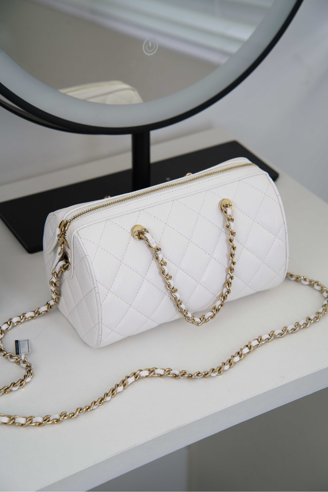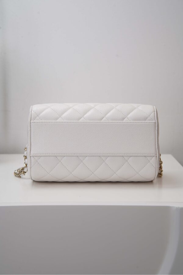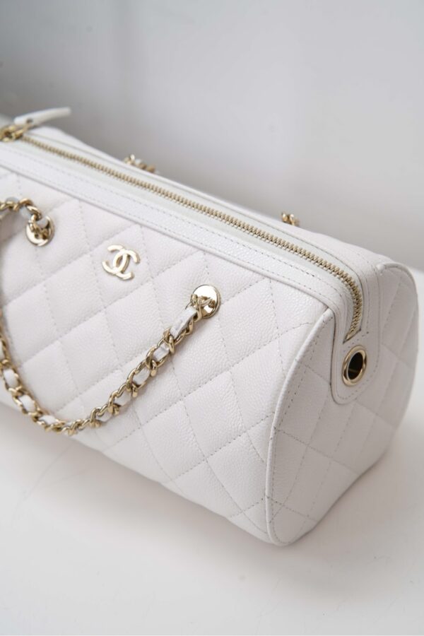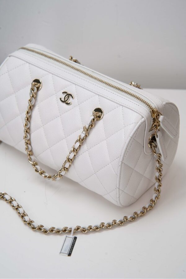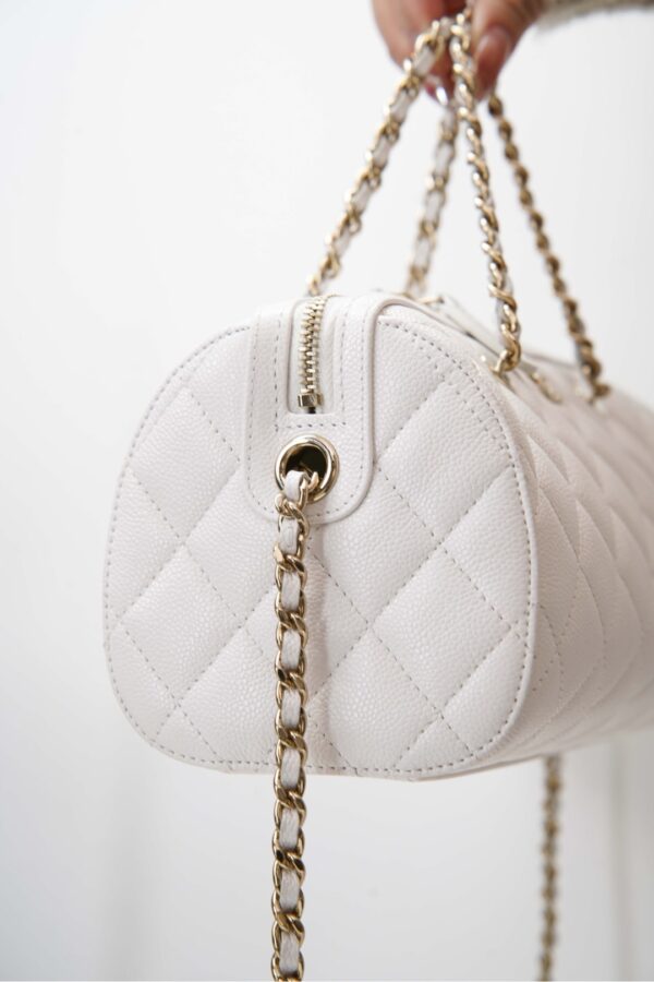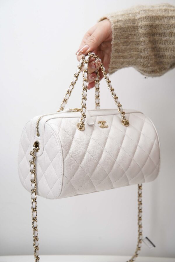 부드러운 질감의 소가죽으로 제작된 샤넬 보울링백입니다. 세련된 화이트 컬러가 어떤 스타일에도 잘 어울리며, 고급스러운 느낌을 더해줍니다.