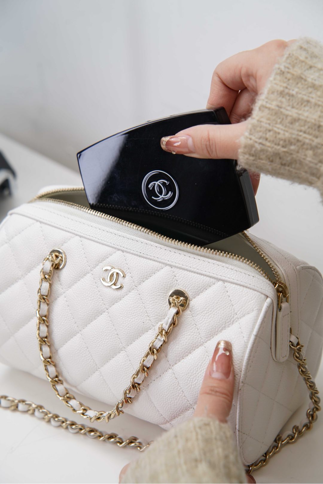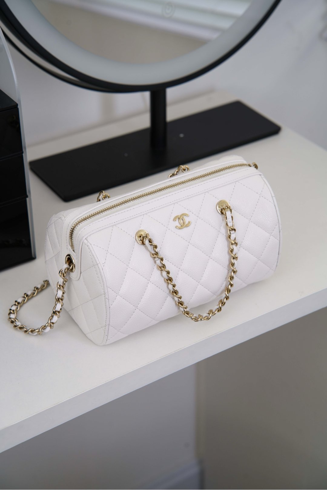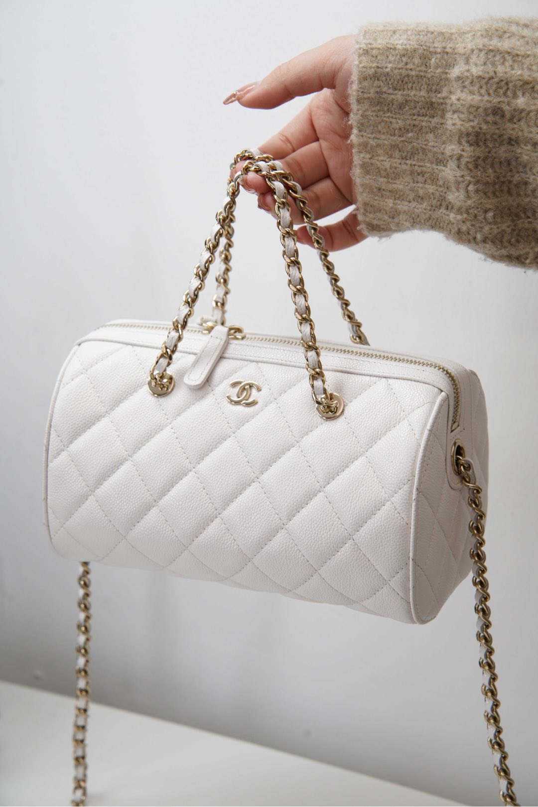 부드러운 질감의 소가죽으로 제작된 샤넬 보울링백입니다. 세련된 화이트 컬러가 어떤 스타일에도 잘 어울리며, 고급스러운 느낌을 더해줍니다.