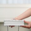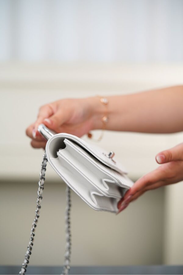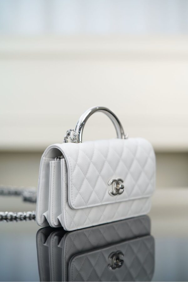 화이트와 실버의 조화로운 색상은 여름철 데일리 룩에 잘 어울리며, 손잡이와 체인 스트랩으로 다양한 착용이 가능합니다.