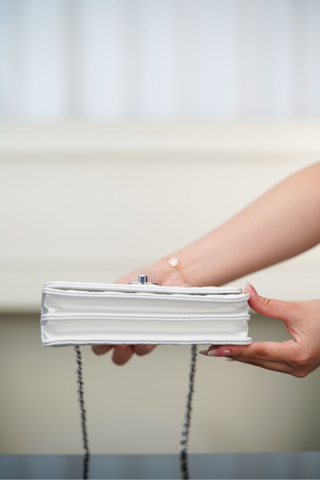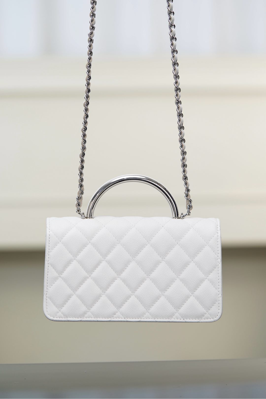 화이트와 실버의 조화로운 색상은 여름철 데일리 룩에 잘 어울리며, 손잡이와 체인 스트랩으로 다양한 착용이 가능합니다.