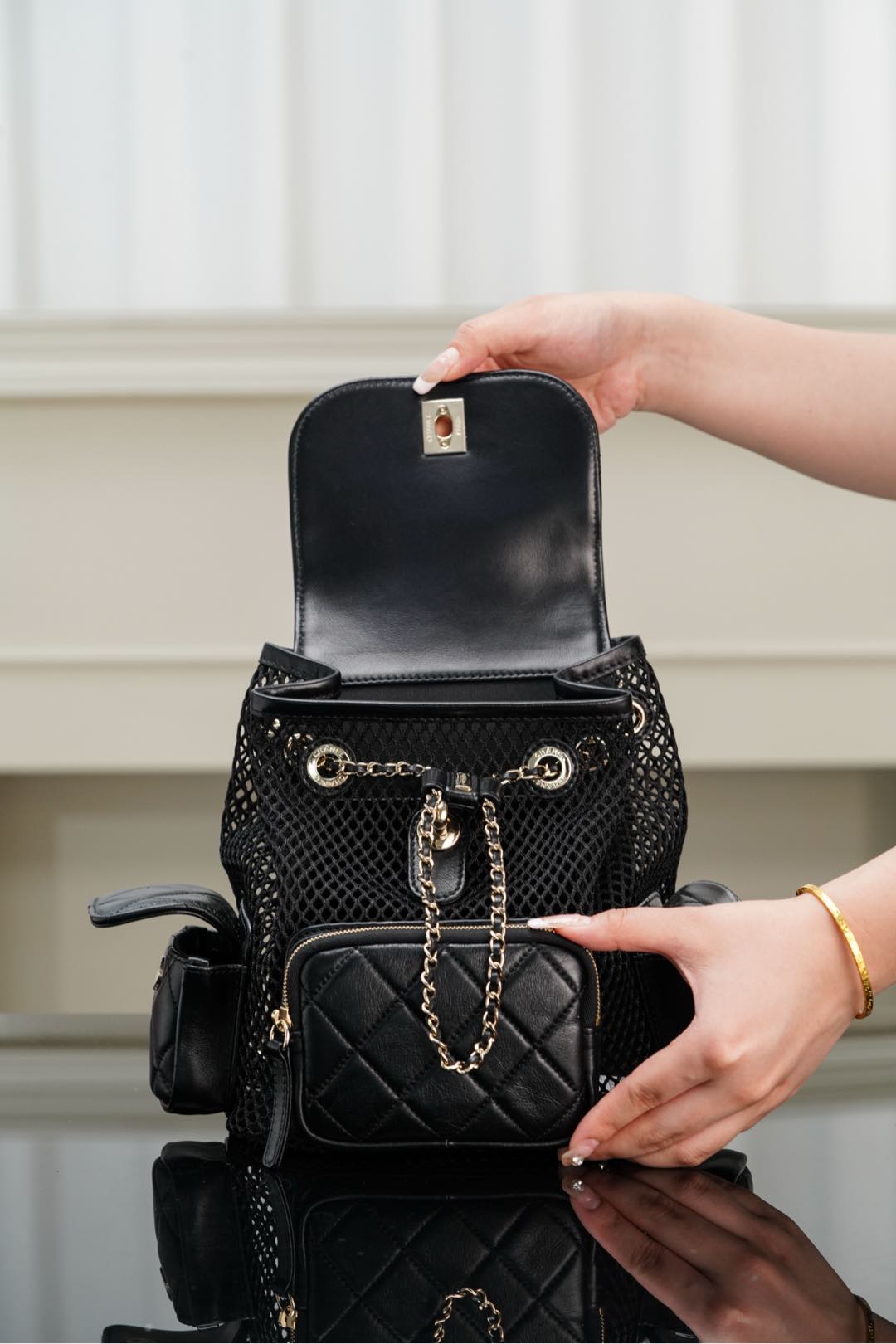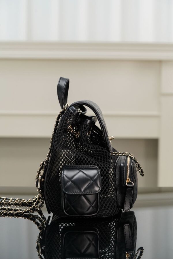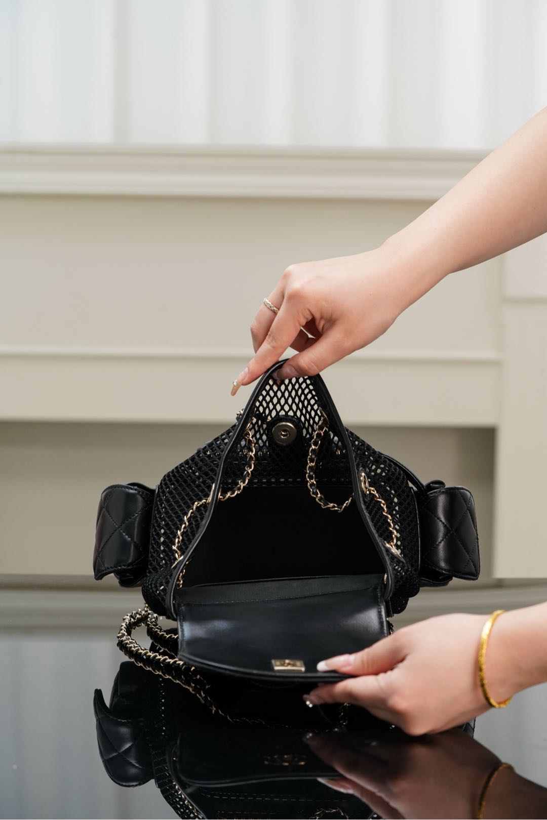 여름의 감성을 담은 샤넬 25s 망사 더블 백입니다. 클래식한 다이아몬드 패턴과 개성 있는 망사가 조화를 이루어 독특한 매력을 발산합니다.