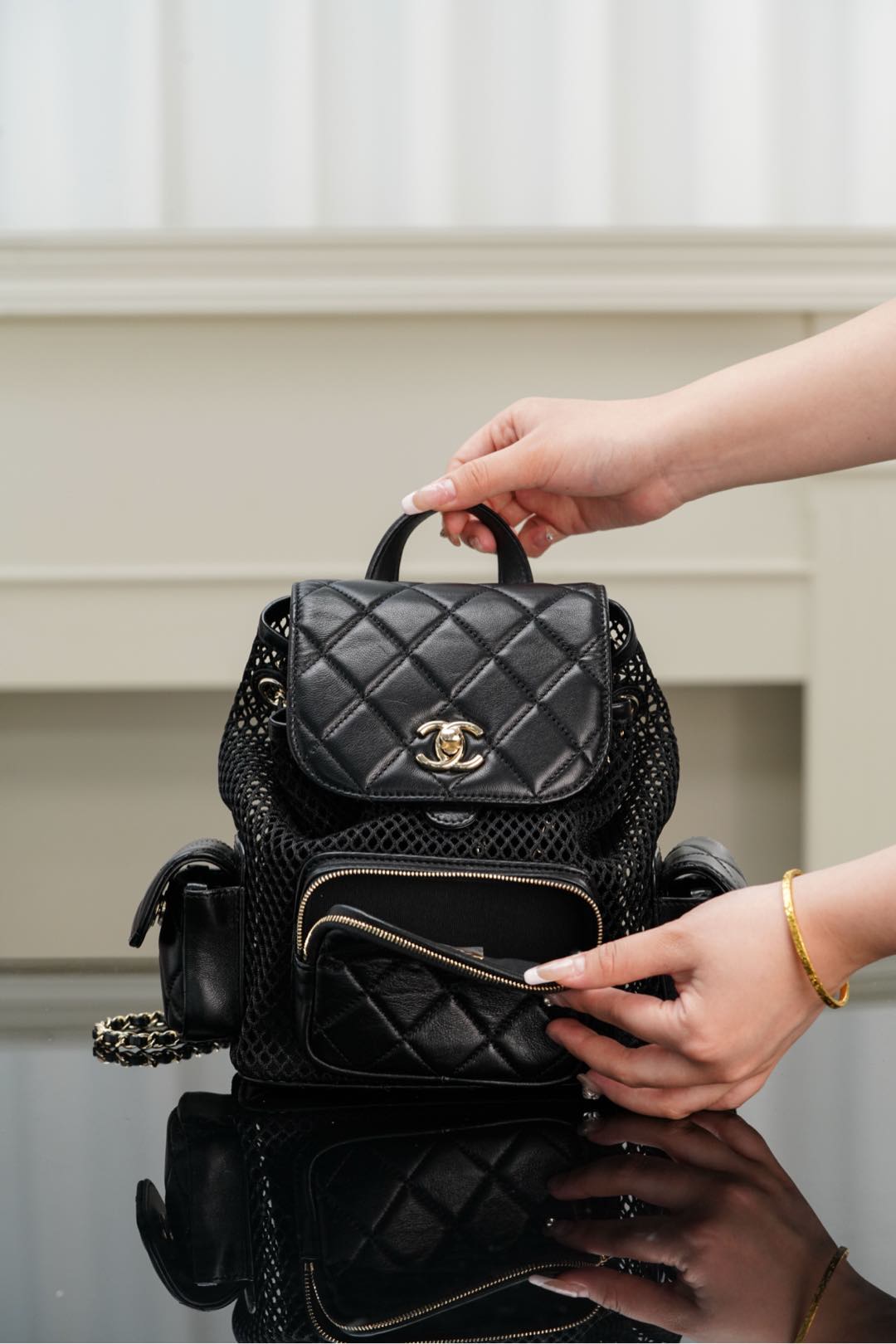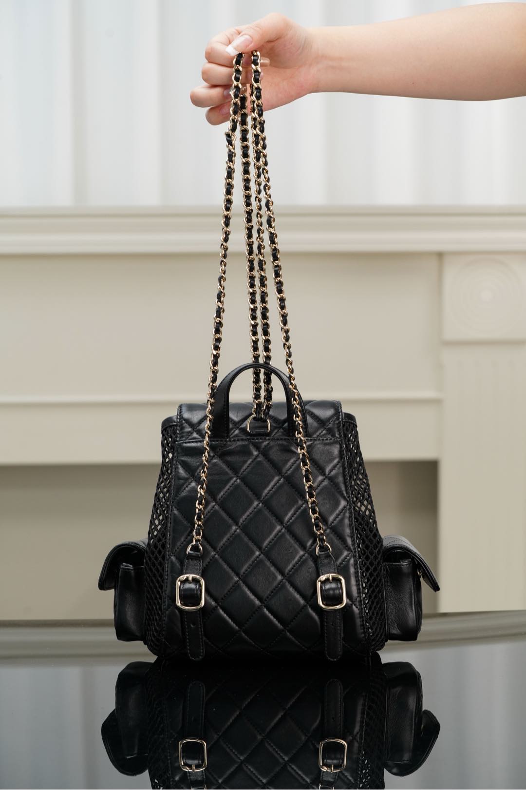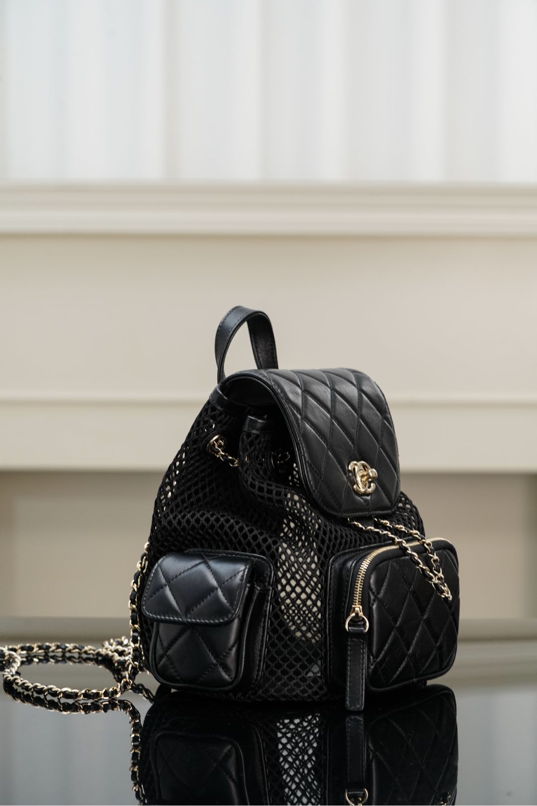 여름의 감성을 담은 샤넬 25s 망사 더블 백입니다. 클래식한 다이아몬드 패턴과 개성 있는 망사가 조화를 이루어 독특한 매력을 발산합니다.