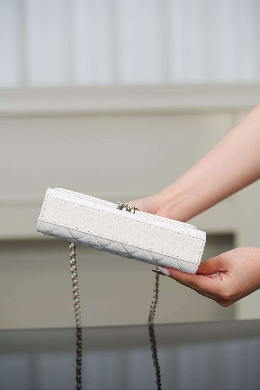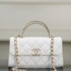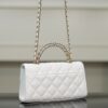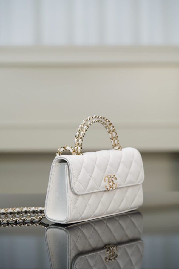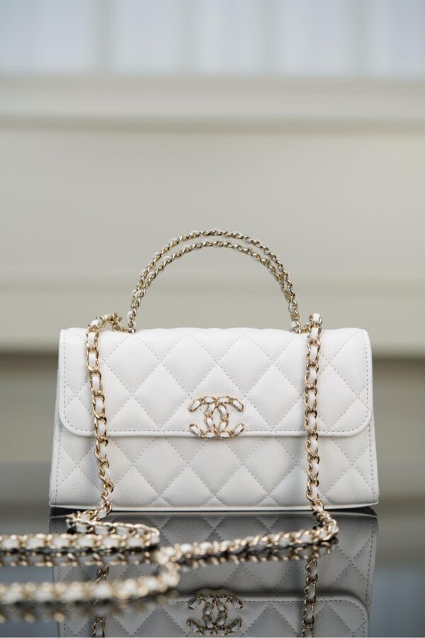 체인 핸들이 독특하게 교차되어 있어 스타일리시함을 더하며, 단肩 또는 손에 들고 다양한 상황에서 활용할 수 있습니다.