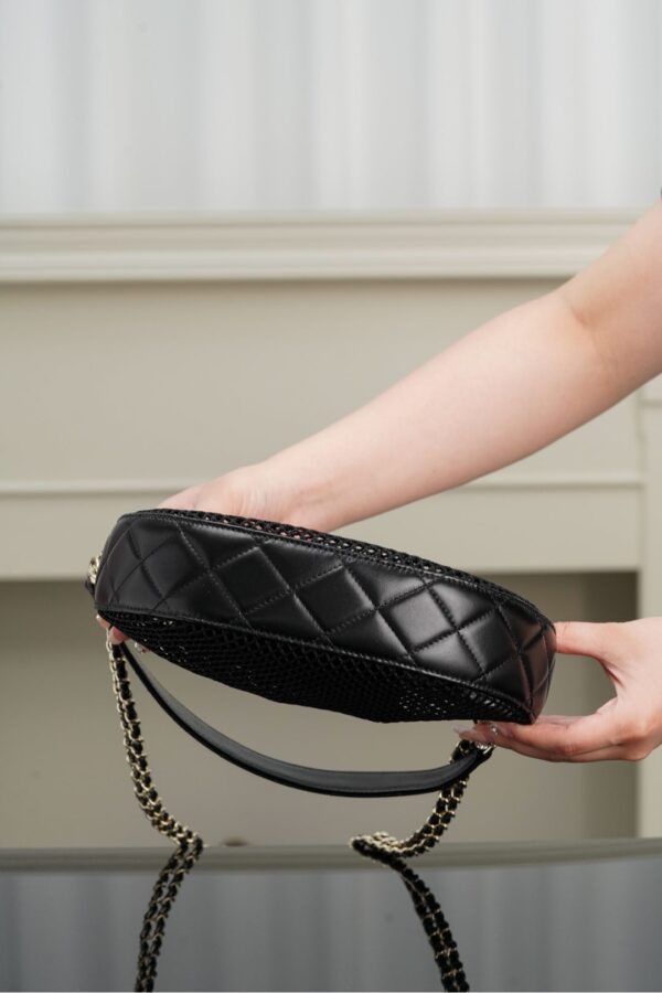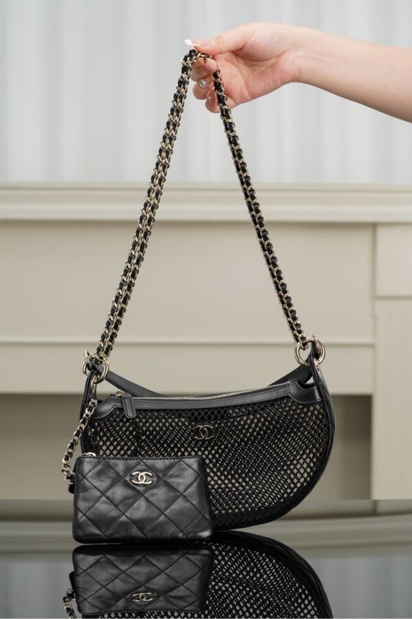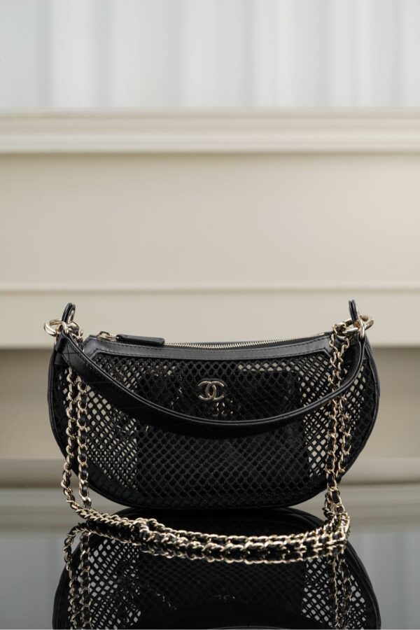 여름 시즌에 어울리는 샤넬의 루프망사 신월백입니다. 독특한 디자인의 망사와 고급스러운 양가죽이 조화를 이루어 세련된 느낌을 줍니다.