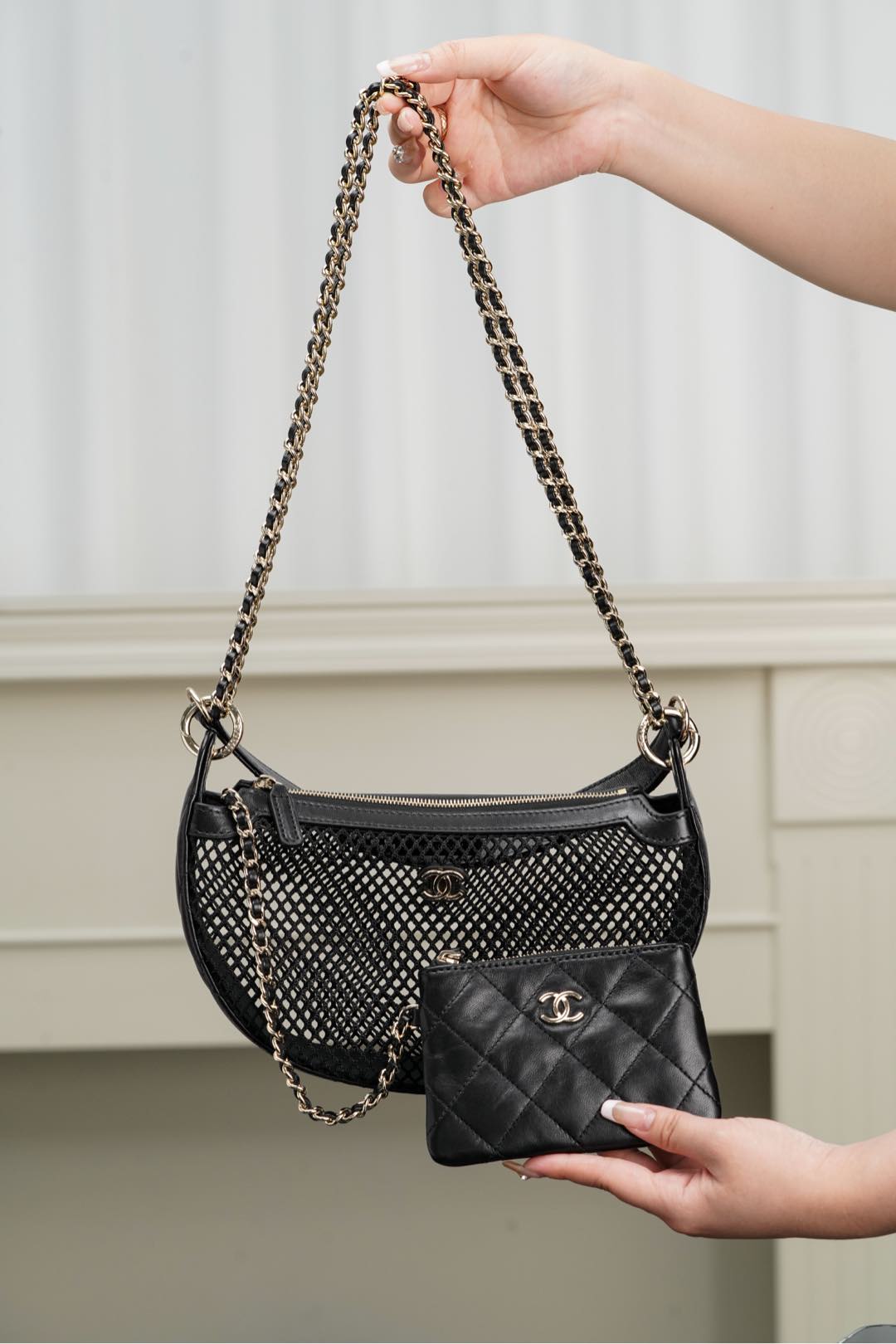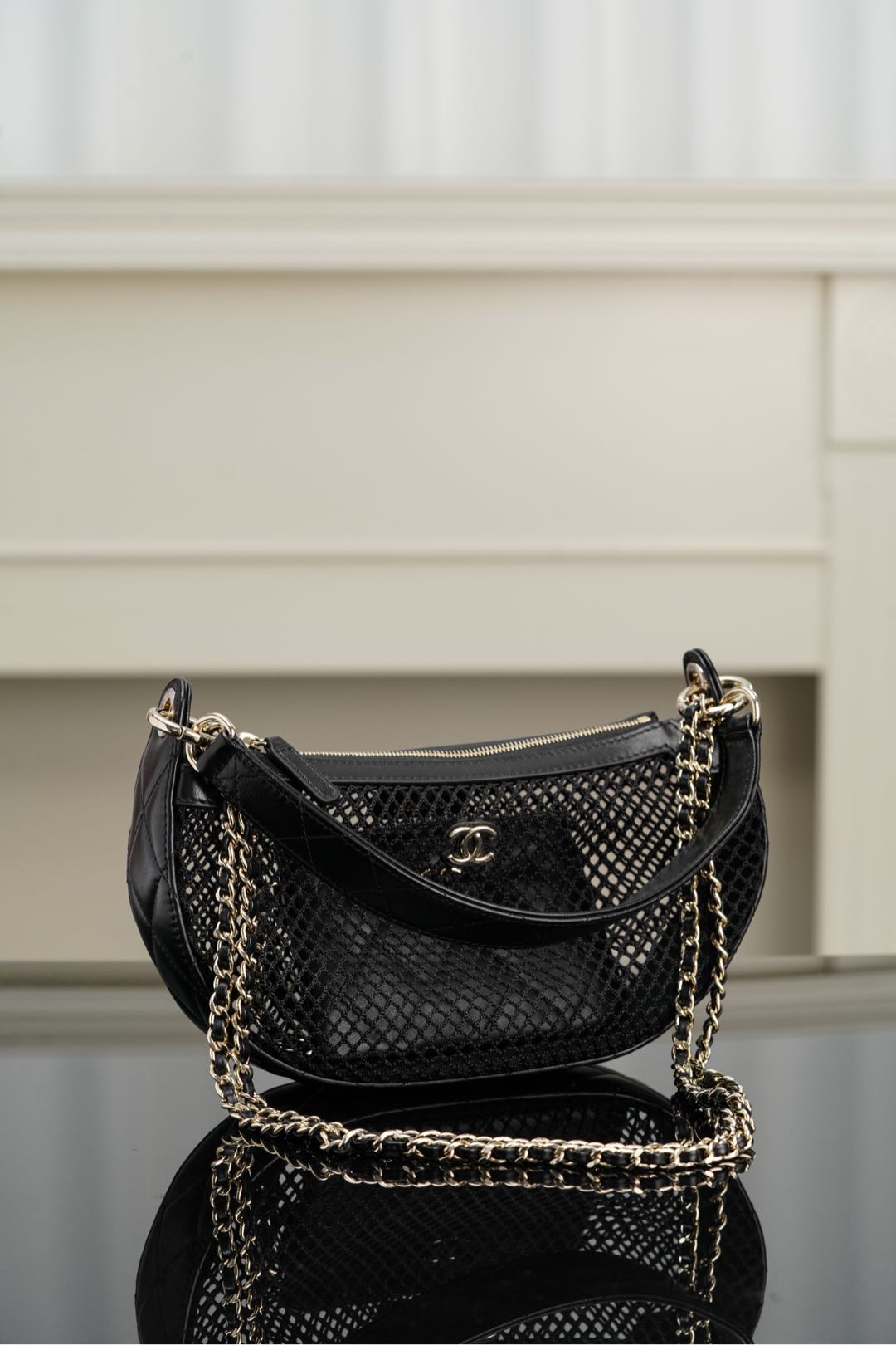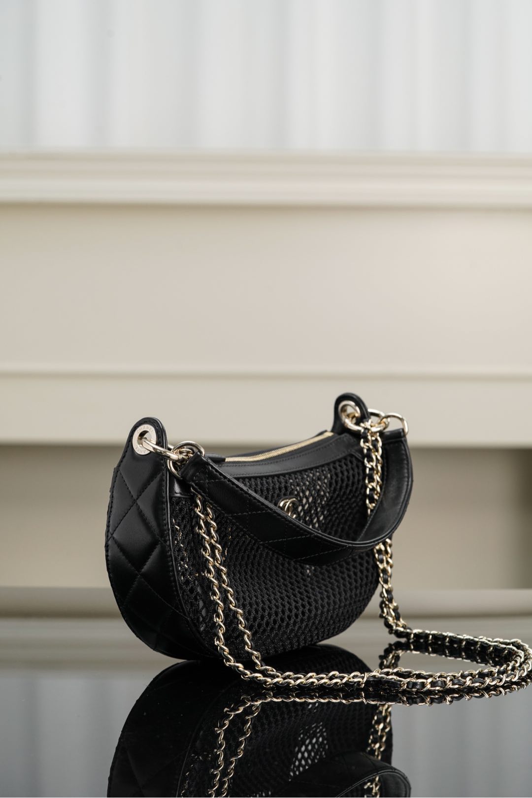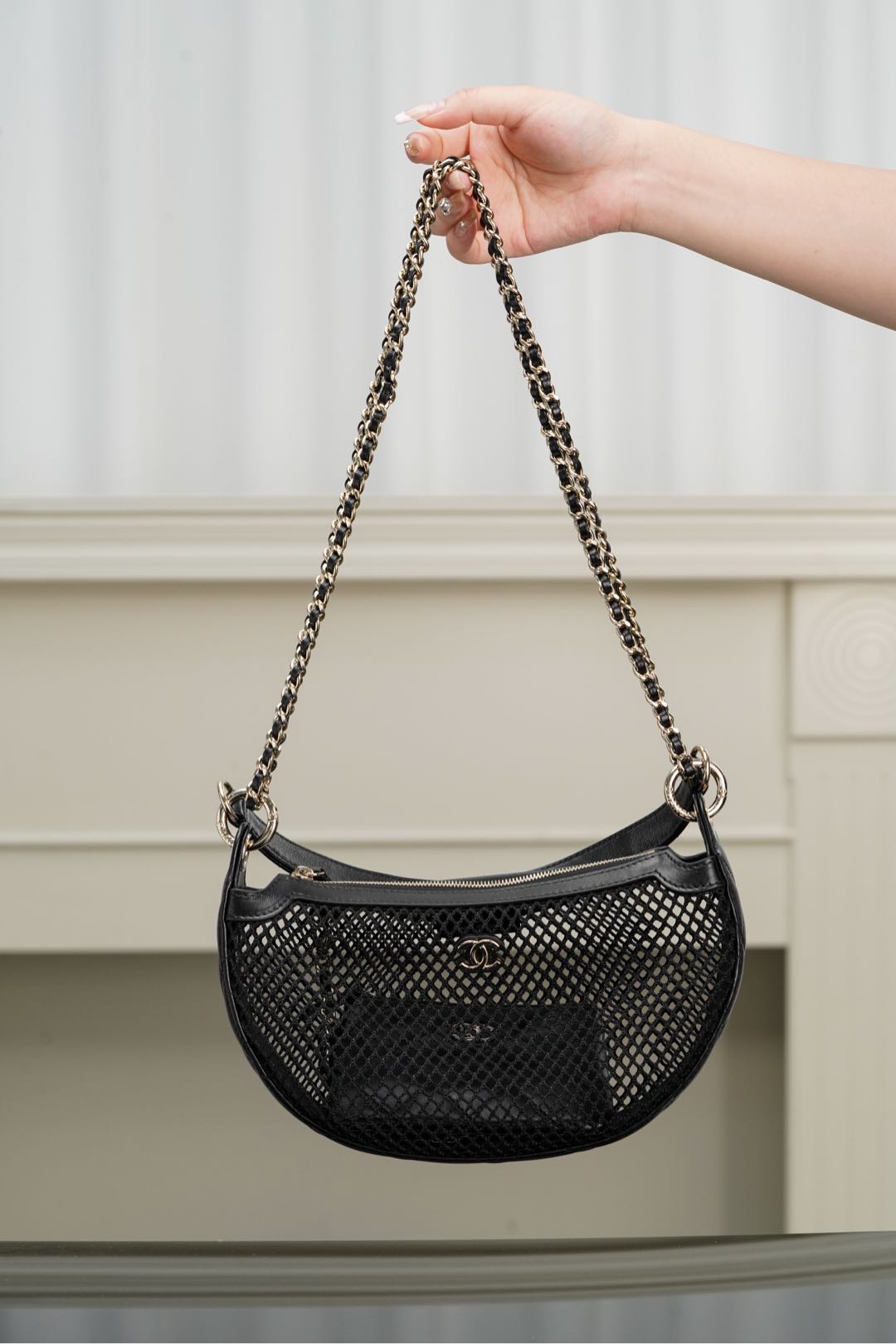 여름 시즌에 어울리는 샤넬의 루프망사 신월백입니다. 독특한 디자인의 망사와 고급스러운 양가죽이 조화를 이루어 세련된 느낌을 줍니다.