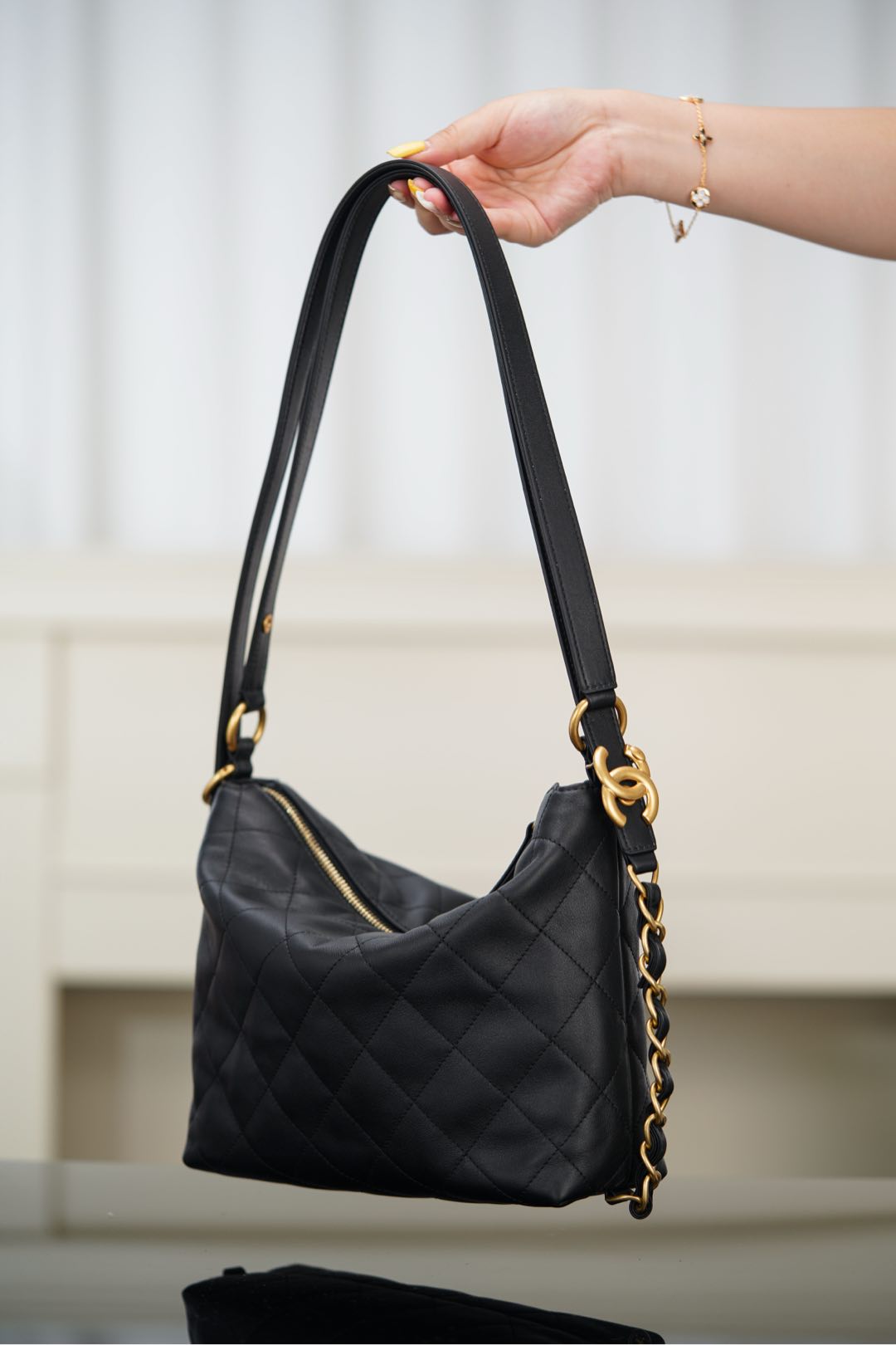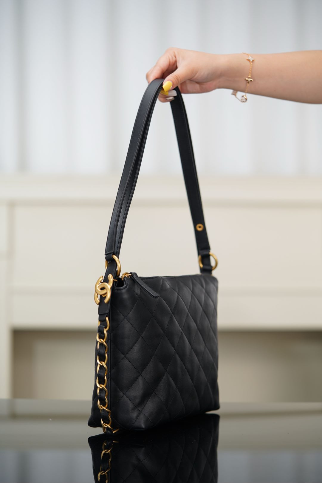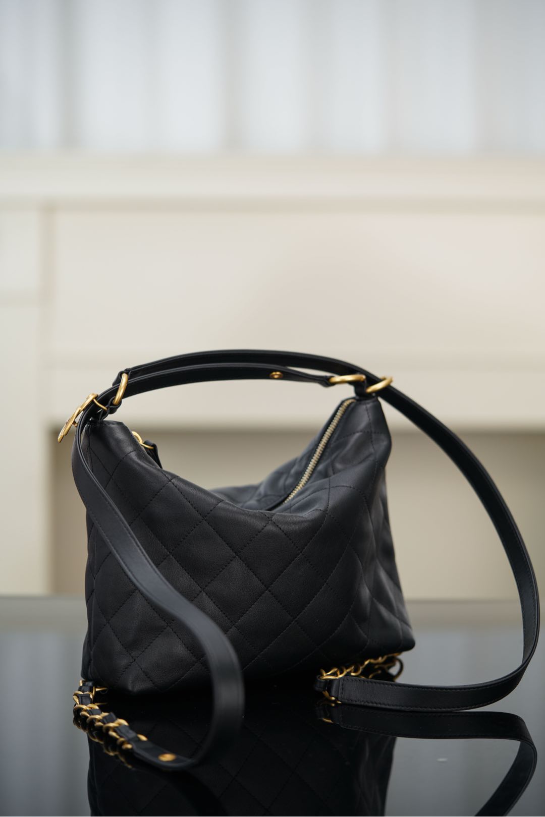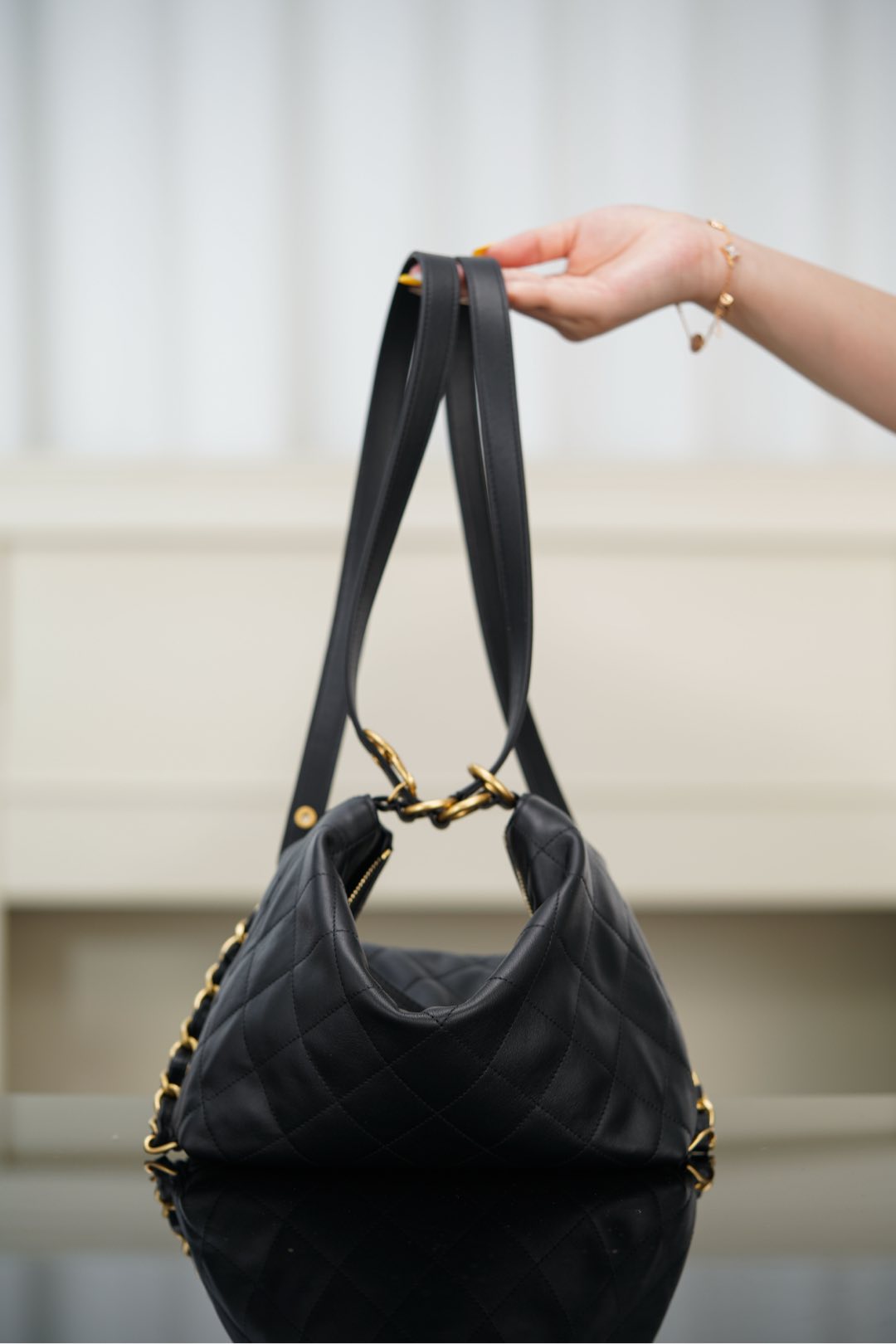 샤넬의 25ss 쇼룸 더블 숄더백은 심플하면서도 세련된 디자인이 돋보입니다. 대형 다이아몬드 퀼팅 패턴이 특징으로, 부드러운 소가죽 소재로 제작되어 고급스러운 느낌을 줍니다.