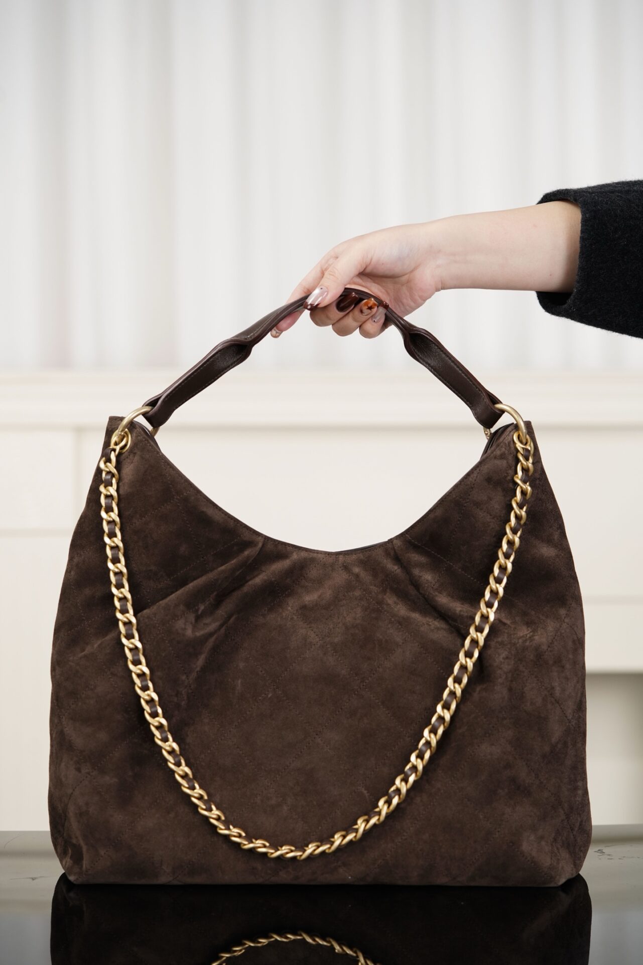 스웨이드 소재는 가을과 겨울에 특히 잘 어울립니다. 손잡이와 금속 체인은 다양한 상황에 쉽게 전환할 수 있게 도와줍니다. 넉넉한 수납 공간으로 일상적인 실용성과 출근용으로도 적합한 대형 가방입니다.