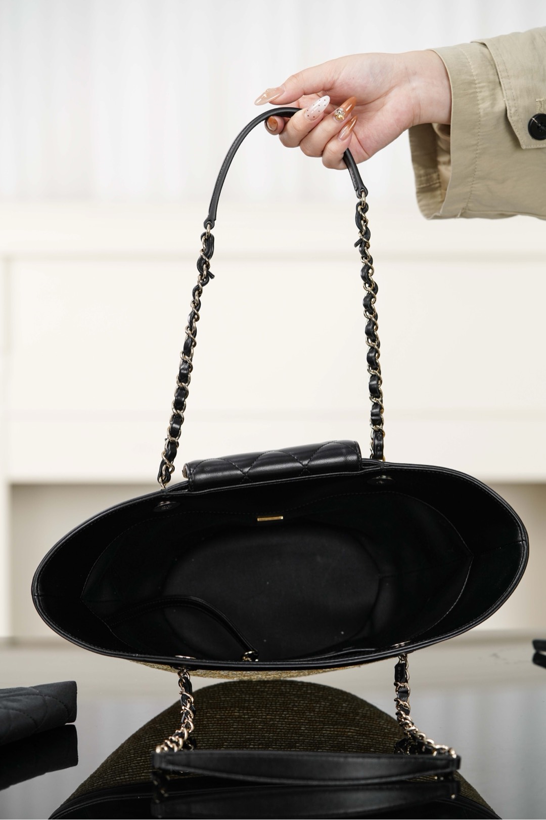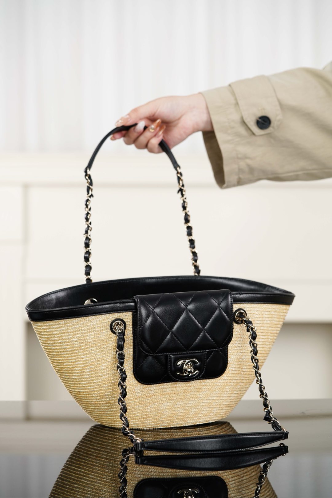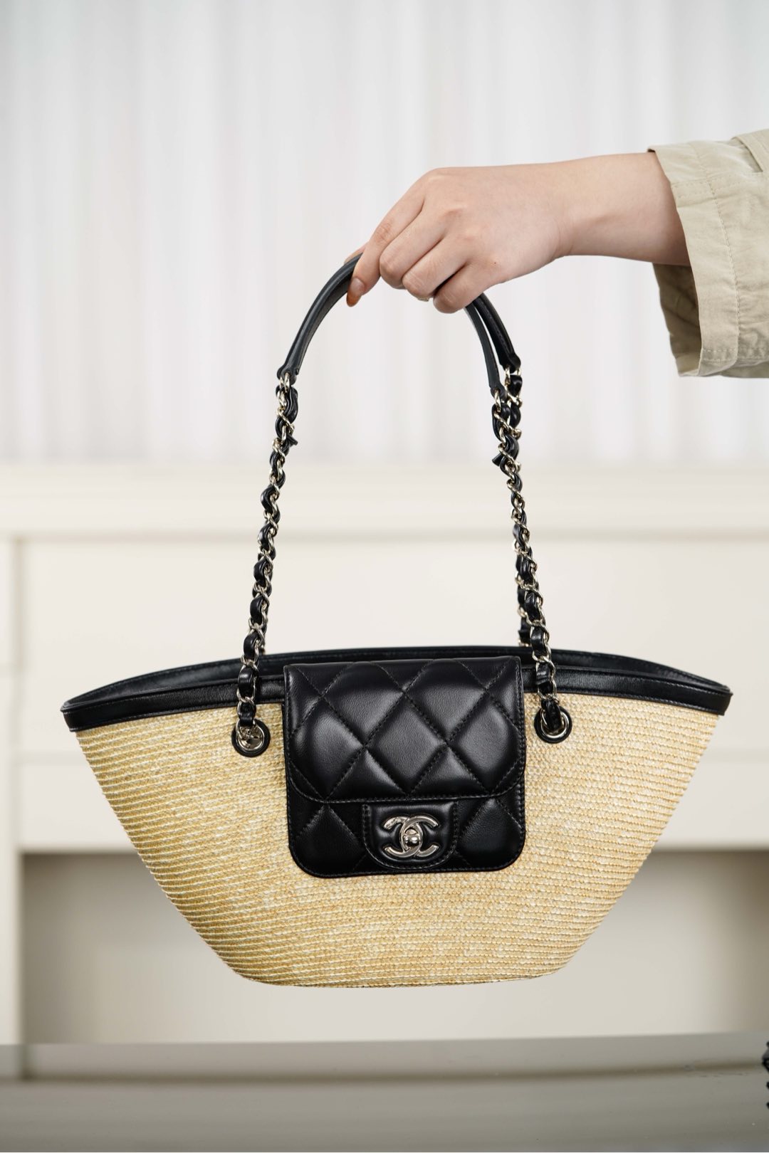 자연스러운 매력을 지닌 손으로 짠 바구니 백입니다. 천연 밀짚으로 정교하게 제작되어 여름 휴가에 완벽한 선택이 될 것입니다.